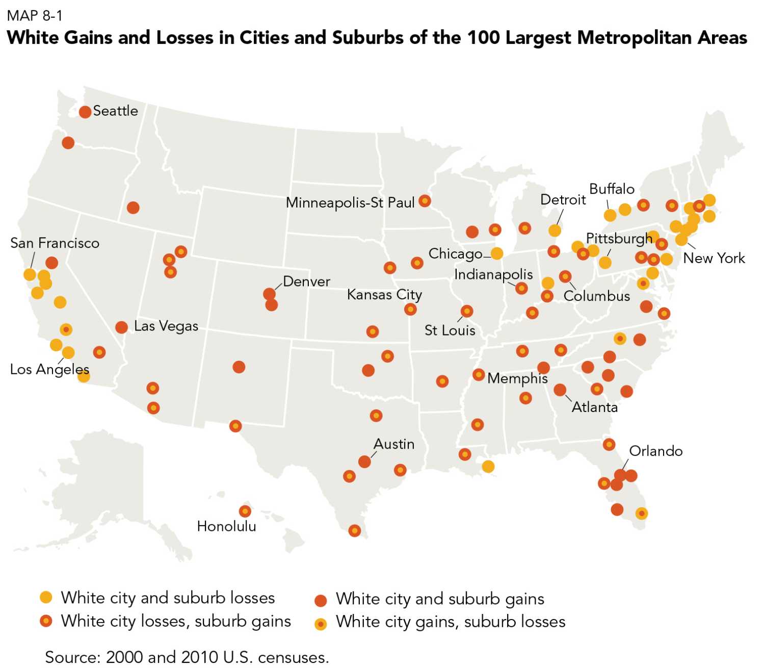 The above map depicts the geography of white population changes in cities and suburbs over the decade. More than one-quarter of the 100 largest metropolitan areas experienced white losses in both cities and suburbs. Less than half (45) of the these areas followed the traditional patterns of white city loss and suburban gain—including Midwest areas such as Columbus, Kansas City, and Minneapolis-St. Paul.