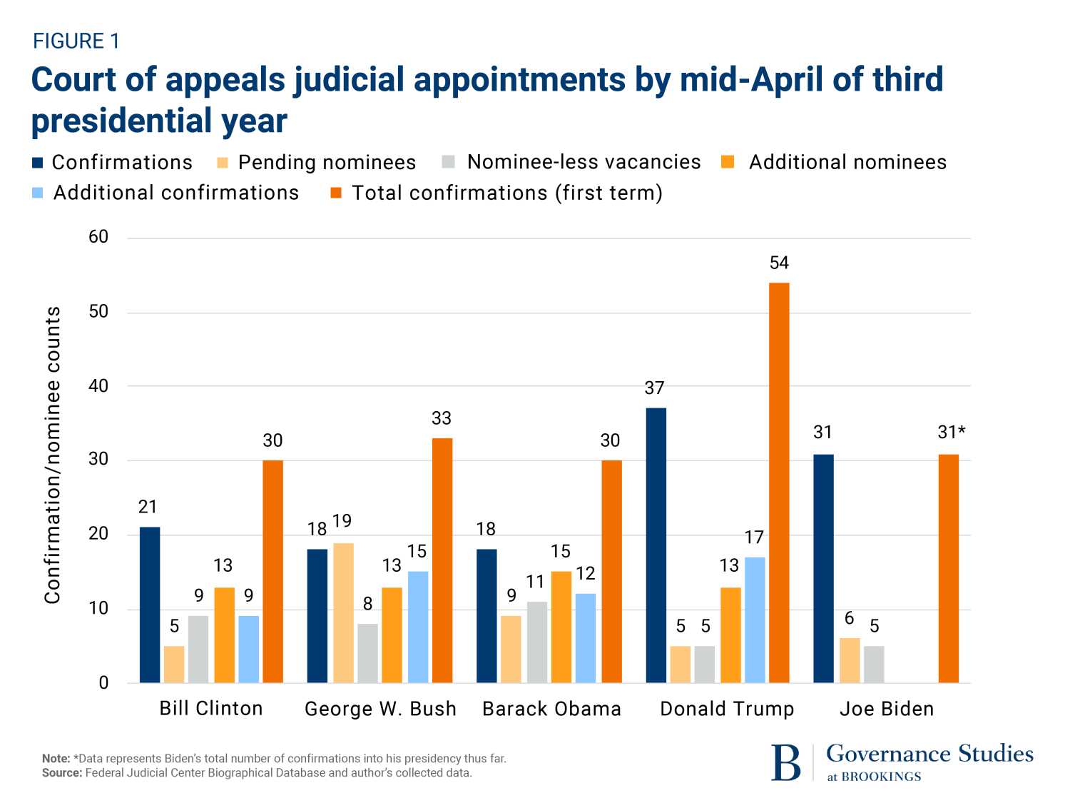 Figure 1 and Figure 2 present key metrics for court of appeals and district court confirmations at the Senate’s April recess in recent presidents’ third years. Each president’s first three bars are the numbers of confirmations, pending nominations; and vacancies with no nominees (vacancies in-place and announced).