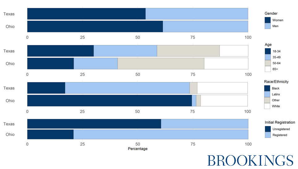 The participants in the two states shared certain demographic characteristics. In both Dallas and Cleveland, women were a larger share of Filer Voter participants than in the general voting-age citizenry; women made up 54 percent of the 2,588 participants in Texas, and 61 percent of the 1,793 participants in Ohio. As expected—given the targeting of VITA services—the participants were also predominantly low-income. In Ohio, the average income for Filer Voter participants was just over $23,000 a year. While Brookings did not have access to individual income data for those who consented to participate in Filer Voter in Texas, we do know that the average income for all VITA clients at those sites was slightly less than $27,000.