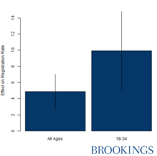 The effects were largest for young people. Among unregistered 18- to 34-year-olds, the program resulted in an 10 percentage point increase in voter registration, as well as a 5.3 percentage point increase in re-registration.3 Those 35 to 49 saw a similar increase in re-registration rates.