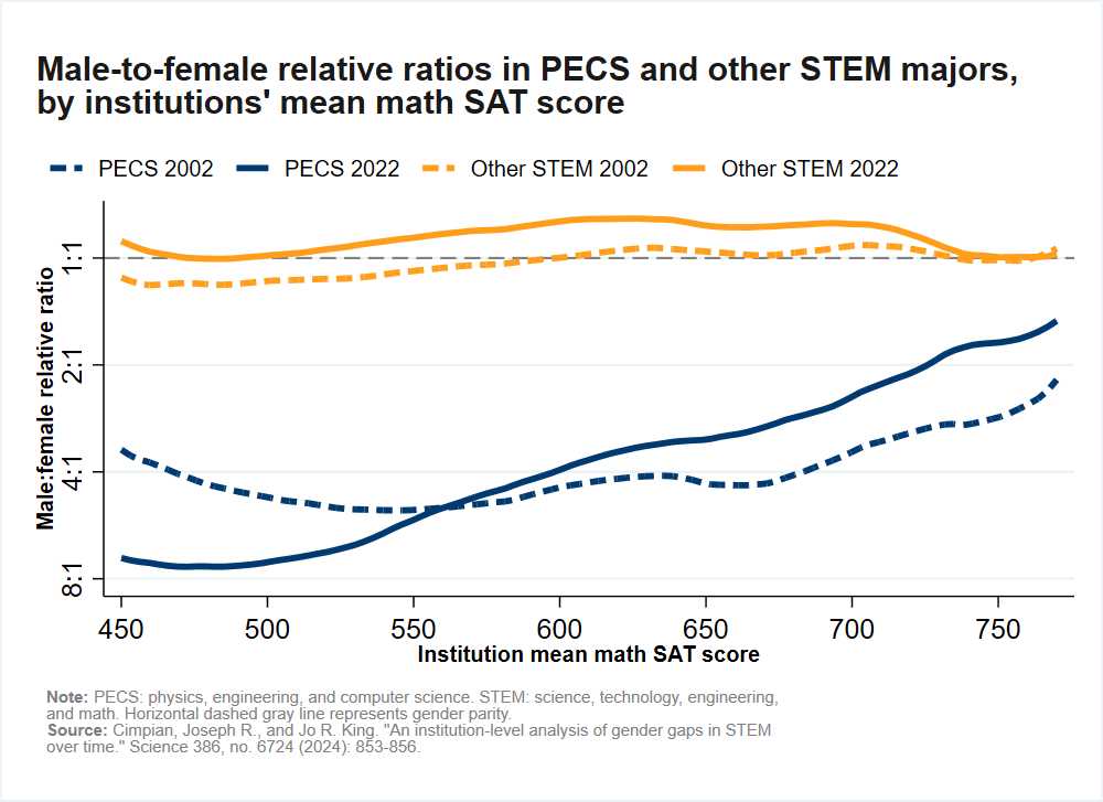 This progress exemplifies a broader trend at postsecondary institutions serving students with high math achievement. Over the past two decades, the universities serving students with the highest math achievement (over 750 for an average math SAT score) have made impressive strides in attracting, retaining, and graduating women in physics, engineering, and computer science (PECS) majors. At these institutions, on average, men are still more likely than women to graduate with degrees in these majors. However, the male-to-female relative ratio shrunk from about 2.2:1 in 2002 to 1.5:1 in 2022.