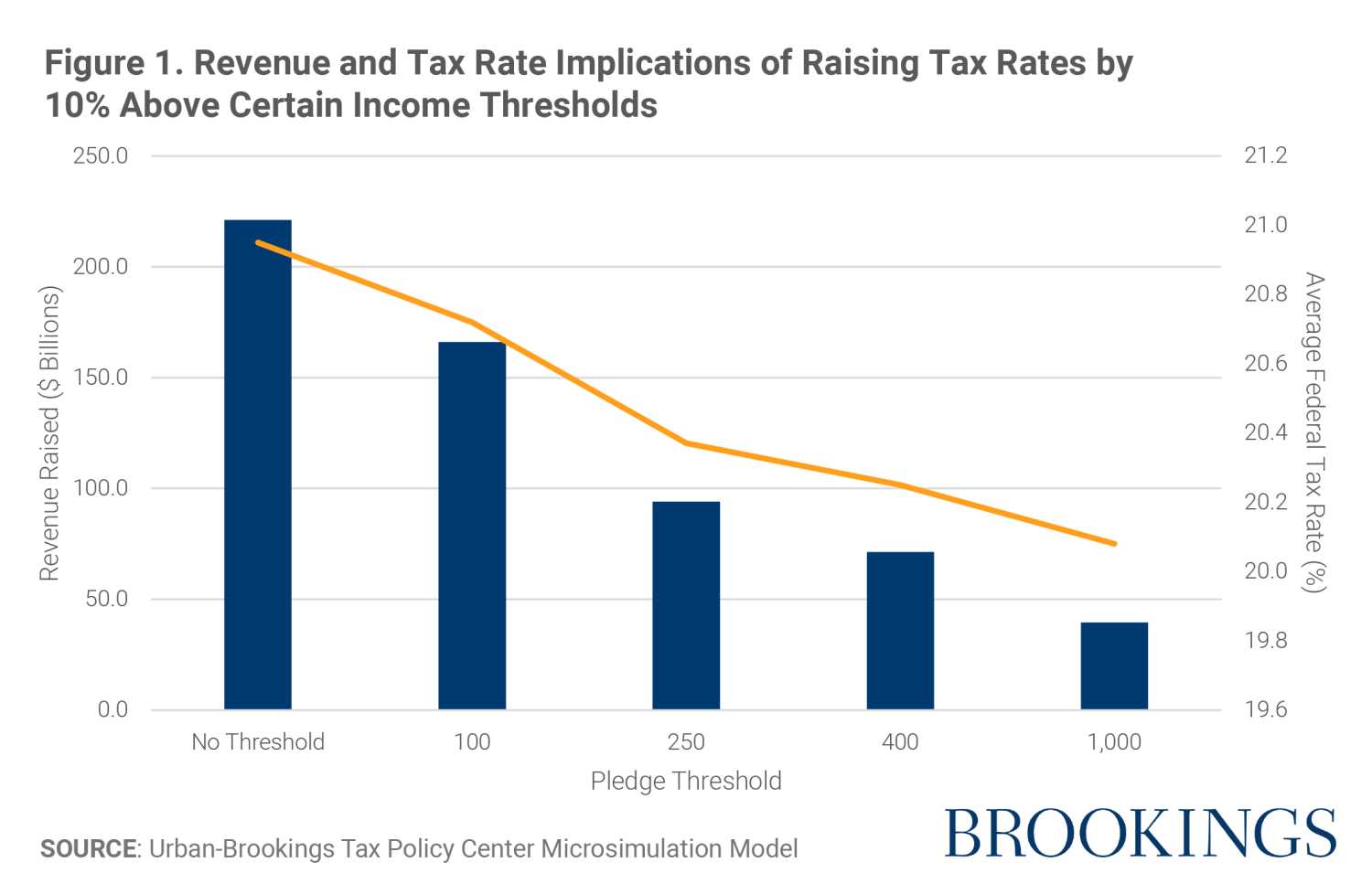 To illustrate the revenue and distributional effects of these types of pledges, we estimate the effect of increasing statutory income tax rates by 10% under different income exemption thresholds using the Urban-Brookings Tax Policy Center microsimulation model. We consider the effect of five salient thresholds: $0; $100,000; $250,000; $400,000; and $1,000,000. In this exercise, the function of the pledge is to exempt taxpayers under the threshold from the tax increase. Specifically, we assume the threshold applies to married couples filing jointly based on adjusted gross income. The threshold for non-married filers is set to be half as large as that of married filers.