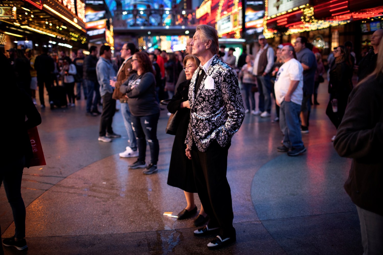 A couple watches street performers in downtown in Las Vegas, Nevada, U.S., February 20, 2020. Picture taken February 20, 2020. REUTERS/Mike Segar