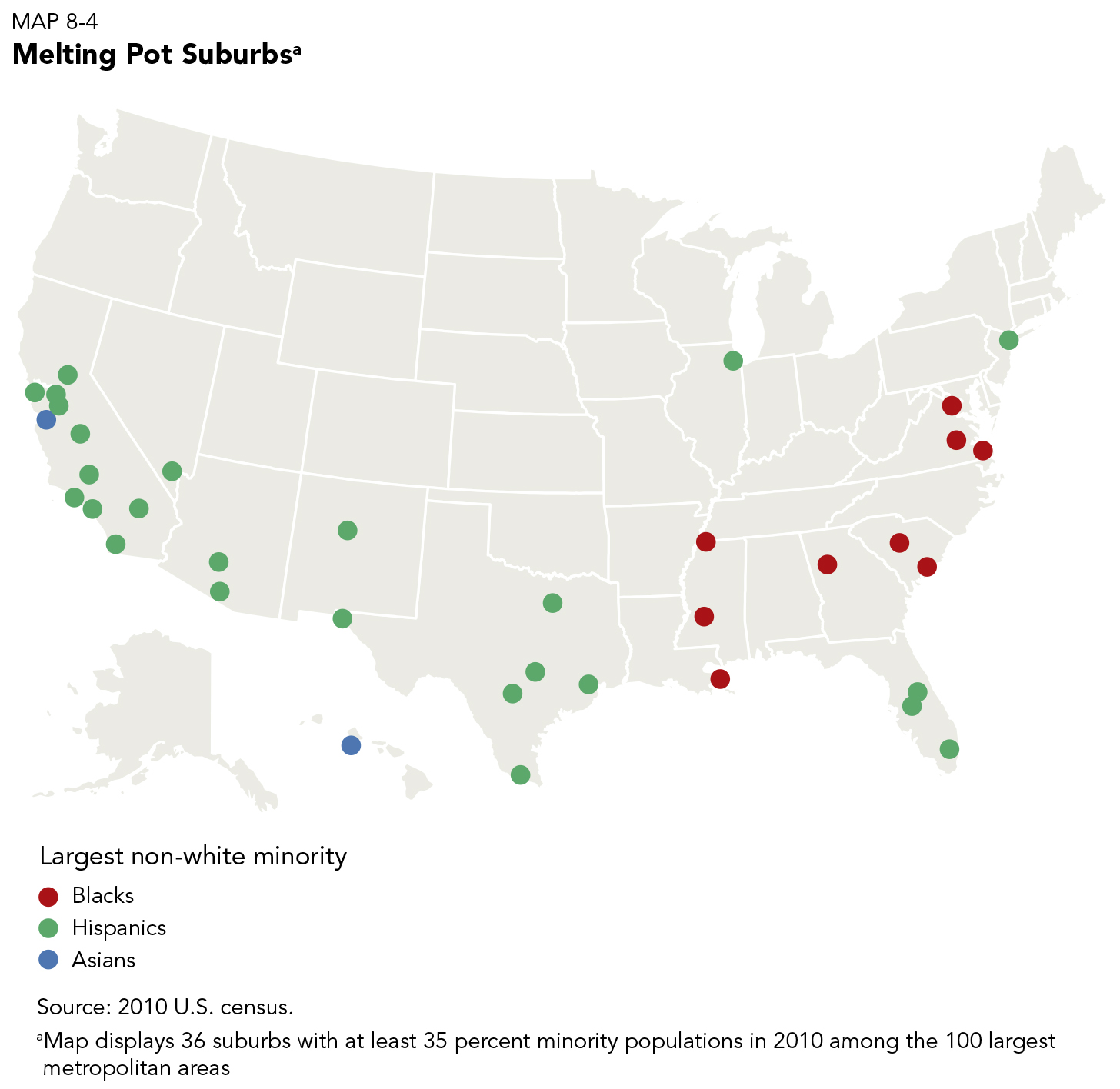 More than ever, major metropolitan suburbs reflect the rest of American society. As discussed in my book, “Diversity Explosion,” this is especially the case with respect to race. Growing numbers of suburban areas are achieving what might be termed “melting pot” status. In 36 of the 100 largest metropolitan areas, minorities represent at least 35 percent of the suburban population, approximately the same share as the nation. Within these, 16 have majority-minority populations, up from just eight in 2000. With a few exceptions such as suburban New York and Chicago, these melting-pot suburbs are located in the South and West (see map). Hispanics are the predominant minority group in most of these suburban areas, an edge they held already by 1990 and continue to hold today despite increasing shares of blacks in the suburbs. Among the 36 highly diverse suburbs, Hispanics represent the largest minority group in 25 versus nine for blacks and two for Asians.