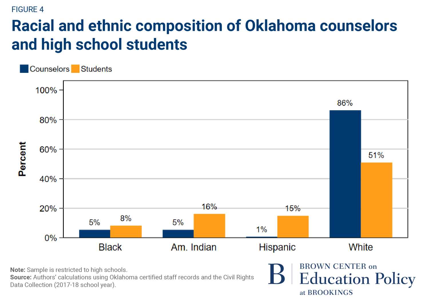 We also find large gaps between high school student and counselor race. Numerous studies in education and public management show that racial representation in positions of authority and mentorship benefit students but that teachers and principals rarely reflect the demographics of the students they serve. Here we find the same for counselors. In Figure 4 we show that on average 16% of Oklahoma high schoolers are American Indian/Native, relative to 5% of Oklahoma counselors. While about 15% of Oklahoma high school students are Hispanic, less than 1% of counselors are. Nationally, 76% of ASCA members are white compared with 51% of school-aged children, while 6% of ASCA counselors are Hispanic compared with 25% of school-aged children; while there are fewer Black counselors than students, the gap is smaller, with Black counselors comprising 11% of the profession relative to Black students representing 14% of the school-aged population.