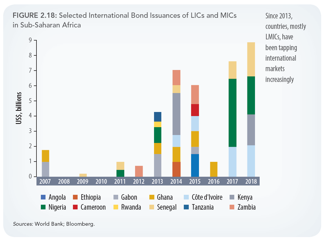 The question of debt sustainability has returned as an issue of concern for the continent and was prominent throughout the Spring Meetings. Debt has been continuously rising, with the average debt-to-GDP ratio increasing by 15 percentage points from 2010 to 2017. Some countries’ debt-to-GDP ratios have multiplied by five during the same period. In the first quarter of 2018, eurobond issuance exceeded Africa’s 2017 year-end amount (Figure 2.18).
