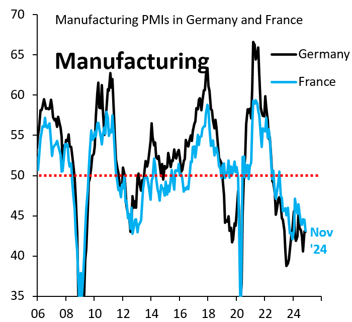 Much attention is being devoted to Germany as the “sick man of Europe,” but recent weakness is more broad-based than that. Figures 3 and 4 show manufacturing and services PMIs, respectively, for Germany and France. Manufacturing sentiment is unambiguously weak in both places, while services sentiment has deteriorated more sharply in France. Given that France and Germany are the two biggest eurozone economies, it is inevitable that this weakness will radiate out to other countries in the single currency.