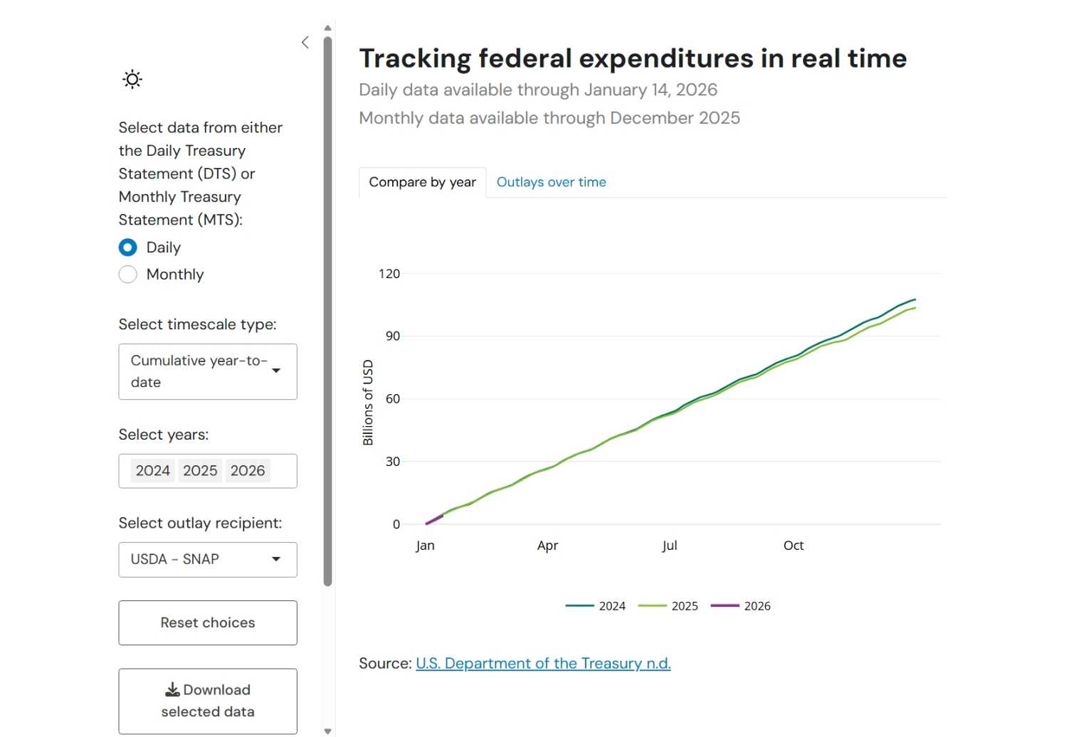 The below examples from the “Compare outlays by year” tab show daily outlays to the United States Department of Agriculture Supplemental Nutrition Assistance Program (SNAP) by “Time series” (above) and “Cumulative year-to-date” (below).