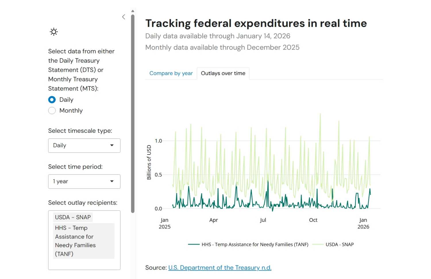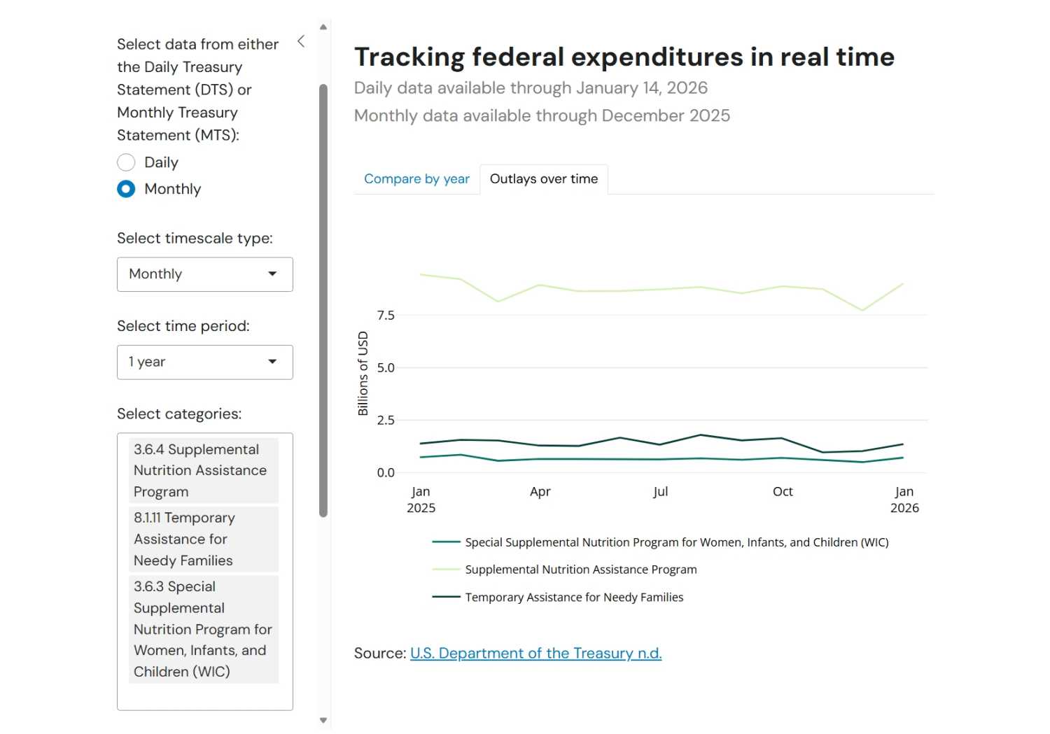 This interactive allows you to explore date from both Daily and Monthly Treasury Statements. Daily Treasury Statements have high frequency data for a more limited set of outlay recipients. Monthly Treasury Statements have lower frequency data for an extensive set of outlay recipients.