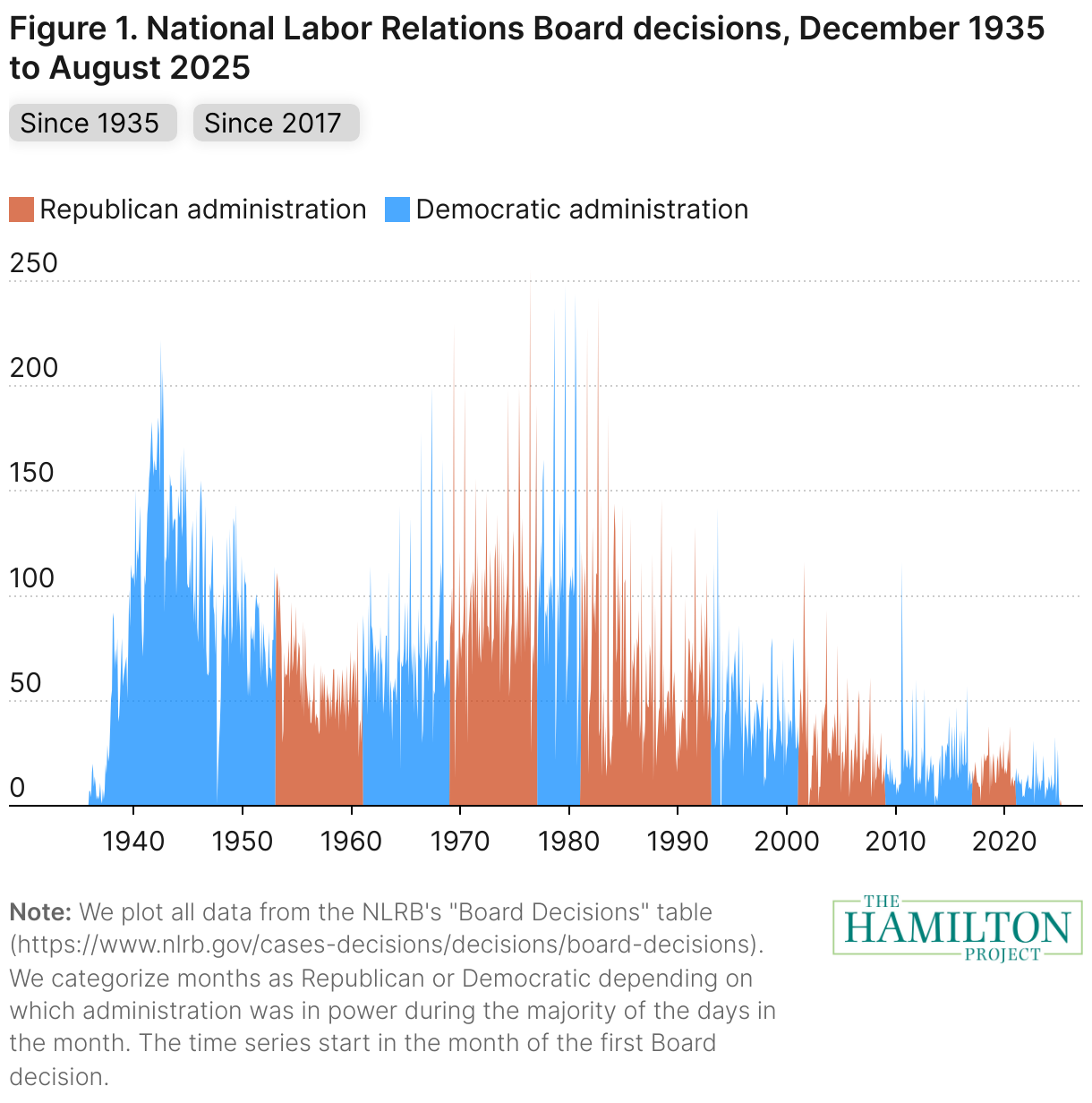 Figure 1 shows published national Board decisions from 1935 to today (users can also zoom to 2010 to present). After President Trump reduced the Board to two members, there were no Board decisions in February 2025. The Board published three decisions in March 2025 when Board Member Wilcox was temporarily reinstated. When Board Member Wilcox was removed again at the end of March, the Board did not publish decisions in April through July of 2025. (Wilcox was reinstated in April for a few days.) Note that the NLRB issues both published and unpublished decisions and needs a quorum to issue either.