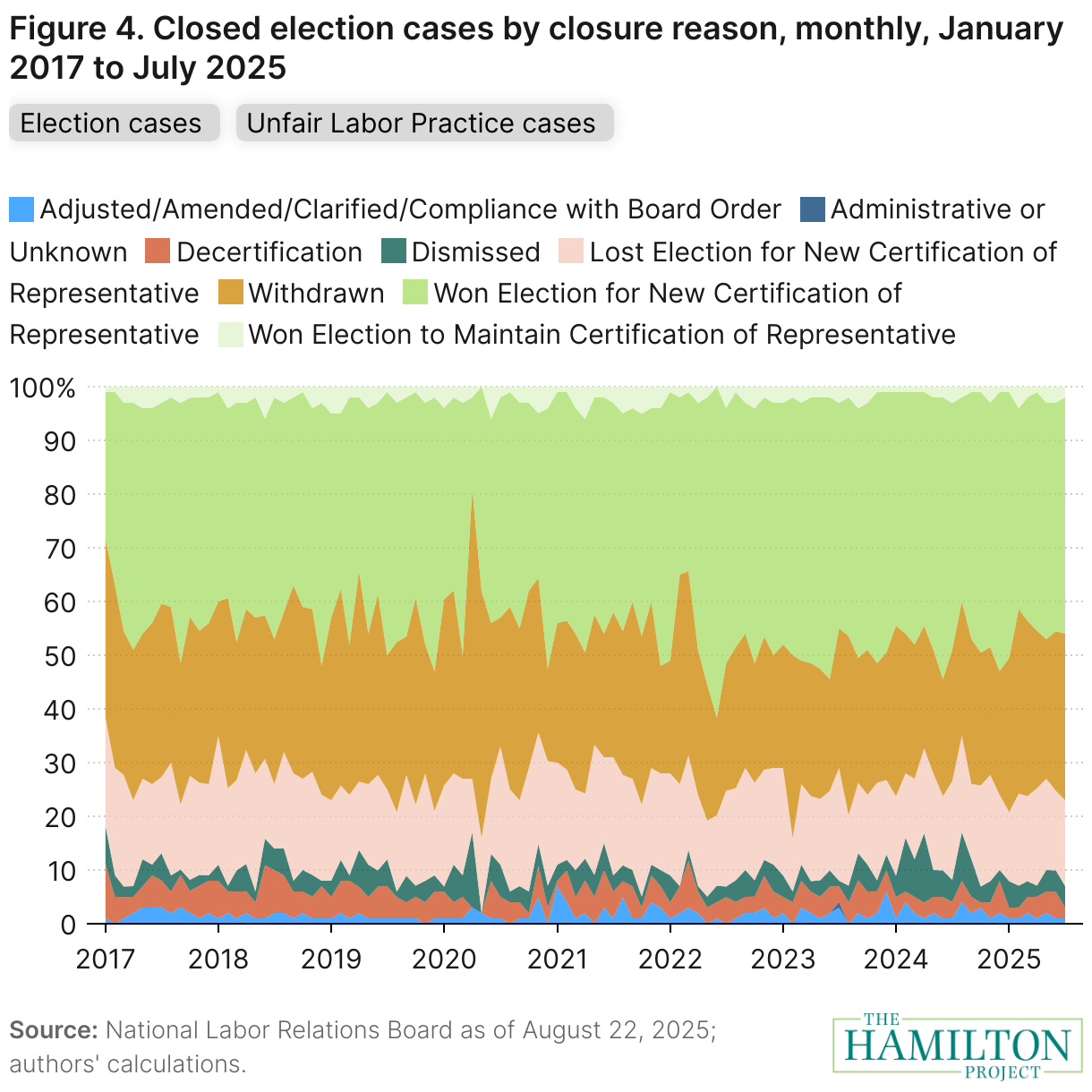 One can also track the reason that cases close (figure 4). For example, cases can close not only because employees win their election for representation, but because the NLRB dismisses the case or because the party that submitted the petition withdraws their case, among other reasons. Between December 2024 and July 2025, the share of total closed election cases that closed because employees newly won representation decreased slightly, from 52 percent to 44 percent.