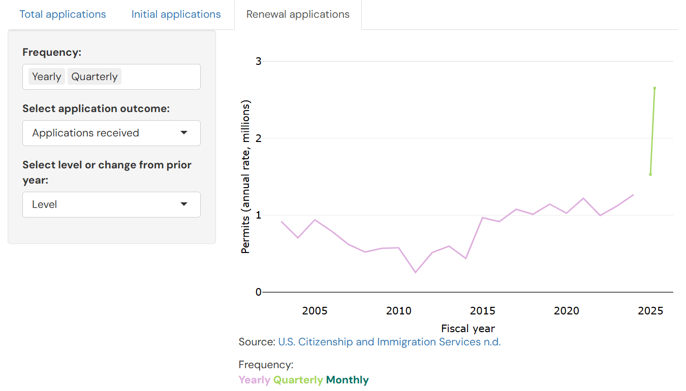 From FY 2003–FY 2024, initial and renewal application data are available yearly. Starting in FY 2025 Q1, initial and renewal application data are available quarterly.