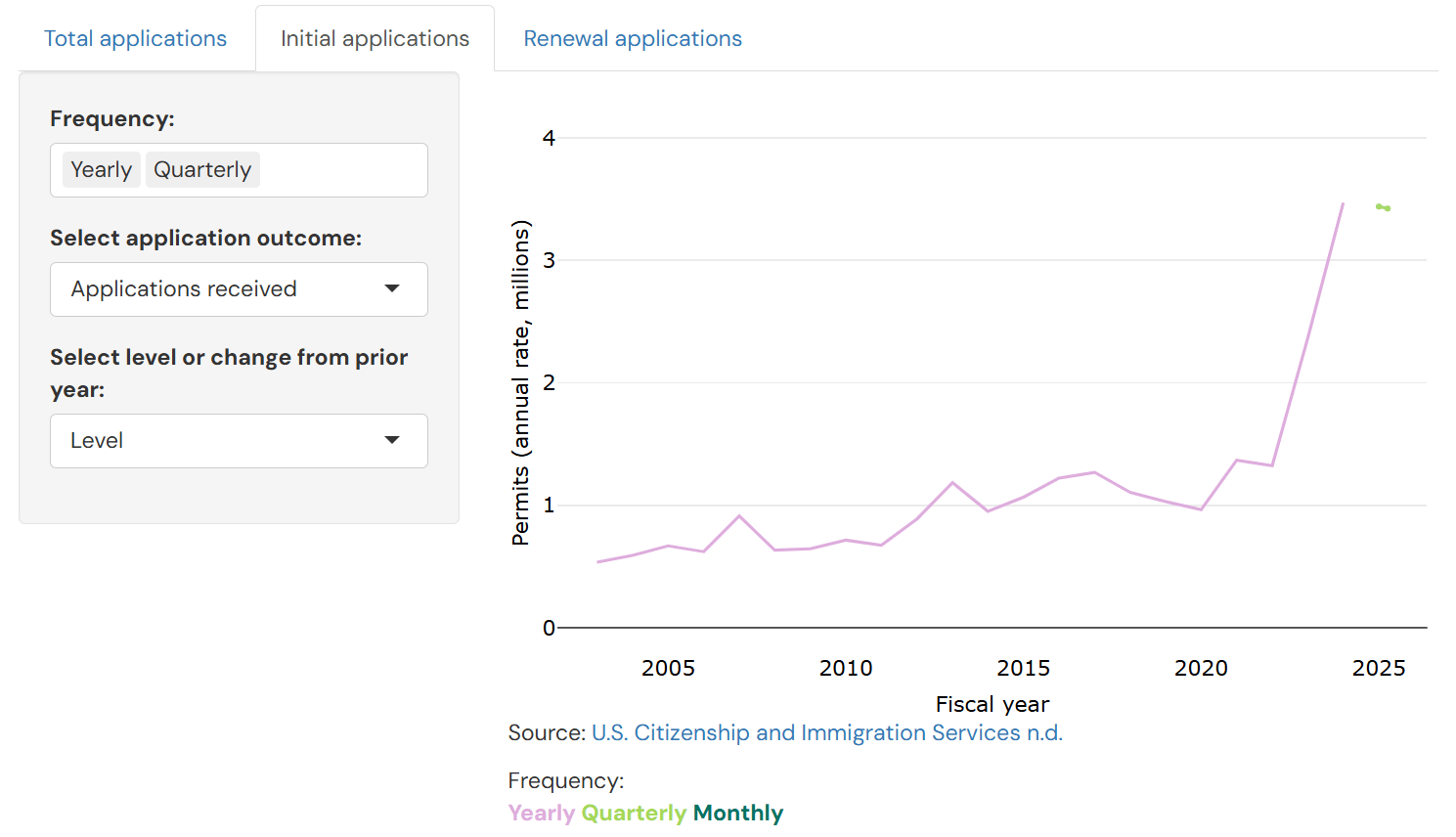 Tracking work permit applications can illuminate how changes in the pace of immigration are affecting labor supply. If immigration policy changes or other factors dampen net migration to the United States, work permit applications should be an early indicator of how much the decline in immigration will slow labor force growth. This data tool shows work permit applications and outcomes. By following permit applications and approvals, we can get a sense of how immigration restrictions are likely to affect labor supply growth over time. An analysis of the relationship between work permit applications and their potential effect on labor supply as of January 2025 is available here. Policy changes relating to underlying status led to an increase in pending applications in March that is greater than application receipts and decisions imply.