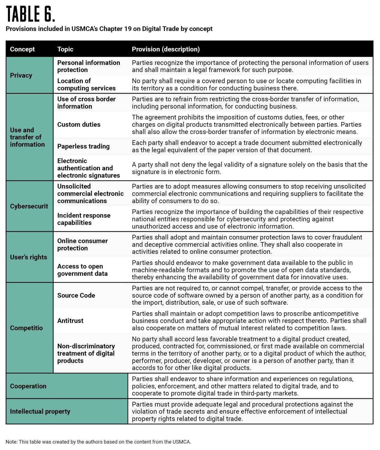 The USMCA’s Chapter 19 on digital trade provides a foundation for better cooperation on integrating North American digital markets. It includes important commitments to cross-border data flows, avoiding data localization requirements, and not requiring access to source code as a condition for market entry (along with exception provisions for legitimate public policy objectives, such as privacy, consumer protection, and national security concerns). This USCMA chapter also supports digital trade by, for example, prohibiting customs duties on electronic transmissions (see table below). More broadly, the chapter creates regulatory stability, encouraging data-driven business models relying on cross-border data flows. The United States International Trade Commission on the digital trade chapter found: “USMCA represents an insurance policy that data flows within the North American economic space will continue to be unrestricted.”4 However, since the agreement came into force, governments are increasingly regulating the digital economy, potentially creating restrictions to cross-border data flows that could hinder digital trade opportunities.