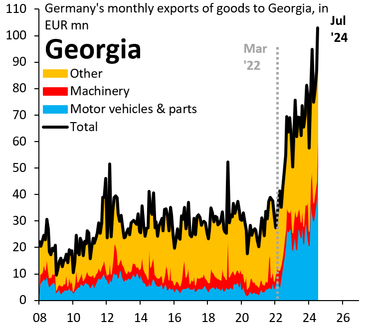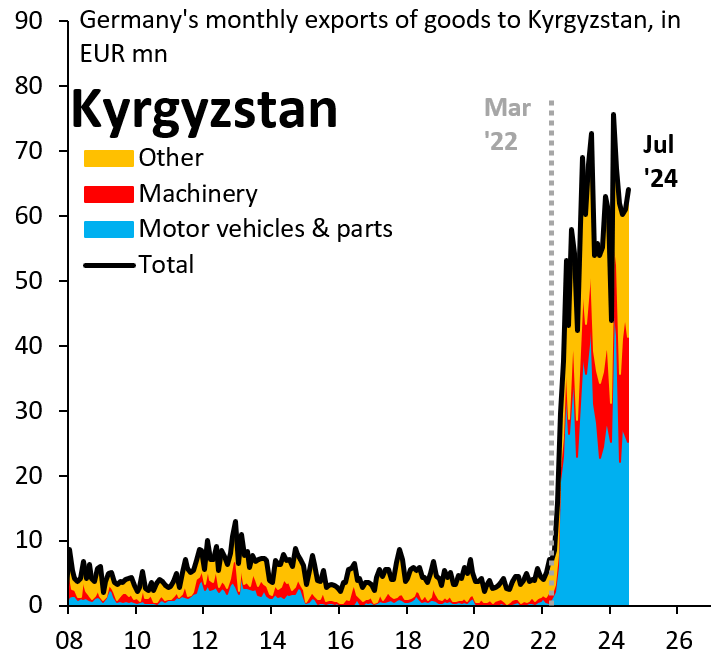 Figures 1 through 4 show German exports to Georgia, Kyrgyzstan, Kazakhstan, and Turkey, respectively, and provide a breakdown of these exports into motor vehicles and parts, machinery, and a residual category we call “other.” As before, these data capture values, not volumes, so it is possible that price effects overstate the magnitude of transshipments, but we think this effect is negligible. Vehicles and parts account for the bulk of the export boom to these countries, though machinery also plays a big role. In all cases, exports rise immediately after Russia’s invasion of Ukraine. In absolute terms, this rise is biggest for Turkey, given its proximity to Europe and the size of its economy.