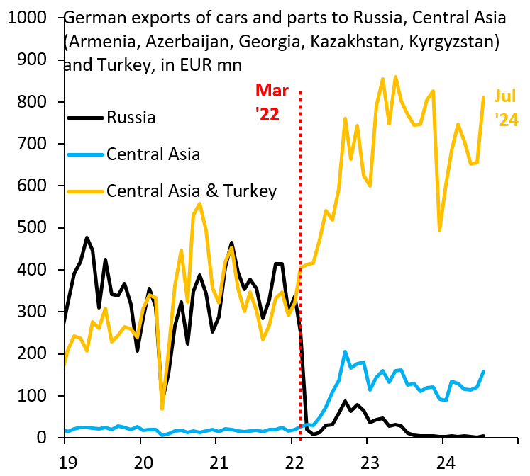 Figure 5. German exports of cars and parts to Russia, Central Asia, and Turkey, in millions of euros