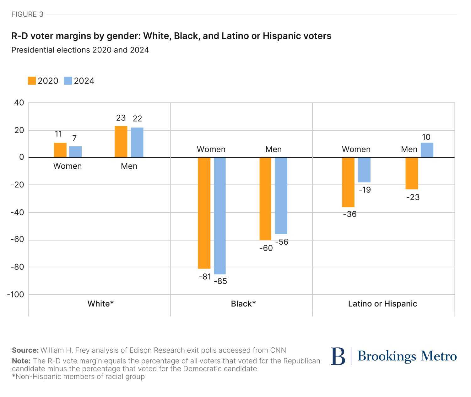 There was only a minor lessening of Democratic support between 2020 and 2024 among Black men, and a modest increase among Black women. Interestingly, among white male voters, R-D margins remained at a similar level, and white female margins declined slightly, from +11 to +7.