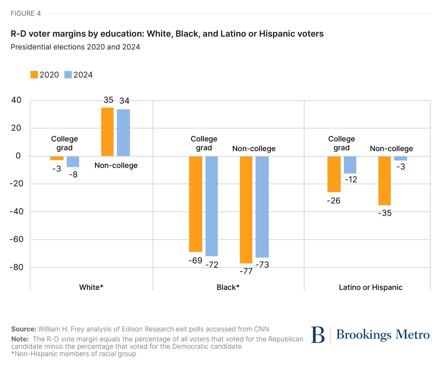 Overall, it is clear that Latino or Hispanic support for Democrats took a substantial hit in 2024. It is most prevalent among men (who flipped to Republican support) and voters who did not graduate from college. Shifts for white and Black voters were not nearly as large.