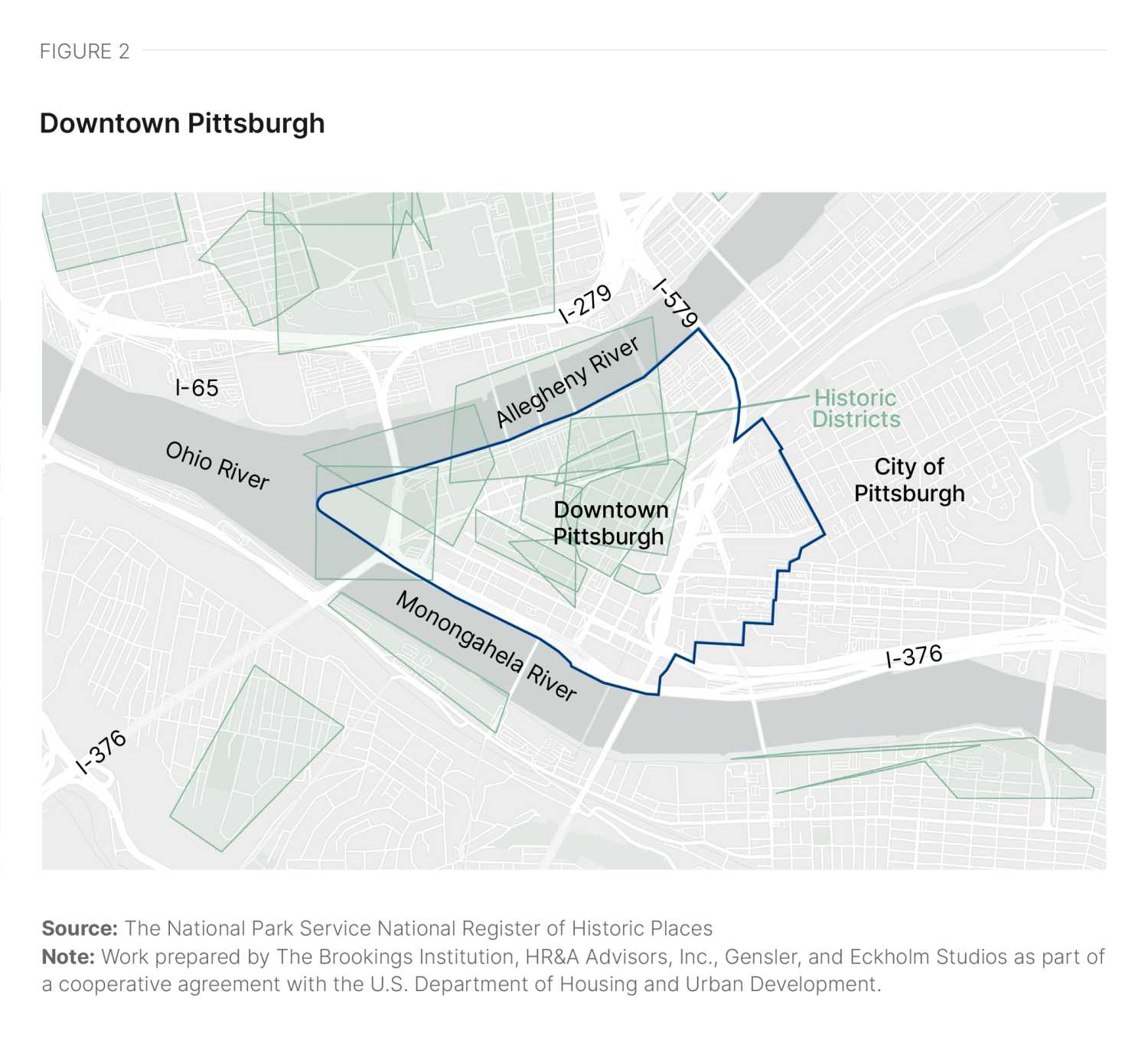 Downtown Pittsburgh is an office-intensive, 0.76-square-mile triangular region at the convergence of the Allegheny, Monongahela, and Ohio rivers (Figure 2). Largely constructed during Pittsburgh’s steel heyday, most of downtown is covered by either a historic district on the National Register of Historic Places or a city-designated historic district.