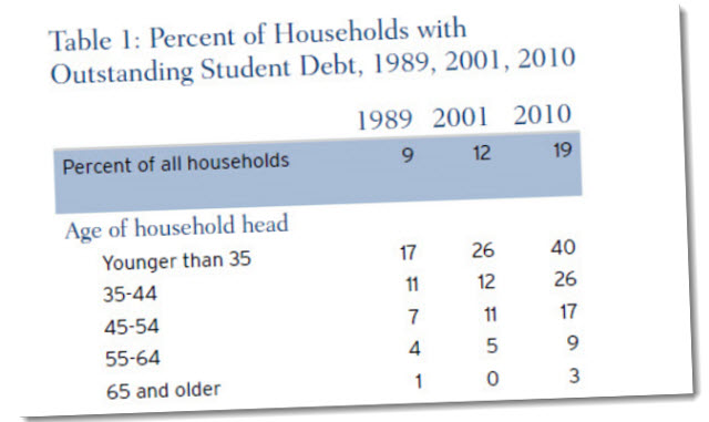 As shown in Table 1, the overall share of households with student debt more than doubled from 1989 to 2010, with the share rising slowly from 9 percent in 1989 to 12 percent in 2001 before jumping to 19 percent by 2010 (Fry 2012). Although the increase throughout this period is largely accounted for by increased prevalence of student debt among households younger than 35, all age groups showed an increase in likelihood of holding a student loan between 2001 and 2010. As of 2010, student loans were owed by more than 40 percent of households under the age of 35, 25 percent of households between 35 and 44, 18 percent of households between 45 and 54, and even 10 percent of households aged 55 to 64. The latter groups presumably represent parents or grandparents who have taken out loans on behalf of their children. In addition, between 2001 and 2010, the prevalence of loans rose significantly in all income groups (especially the 60th to 90th percentiles) and in all educational attainment categories (especially those with some college or who obtained degrees).