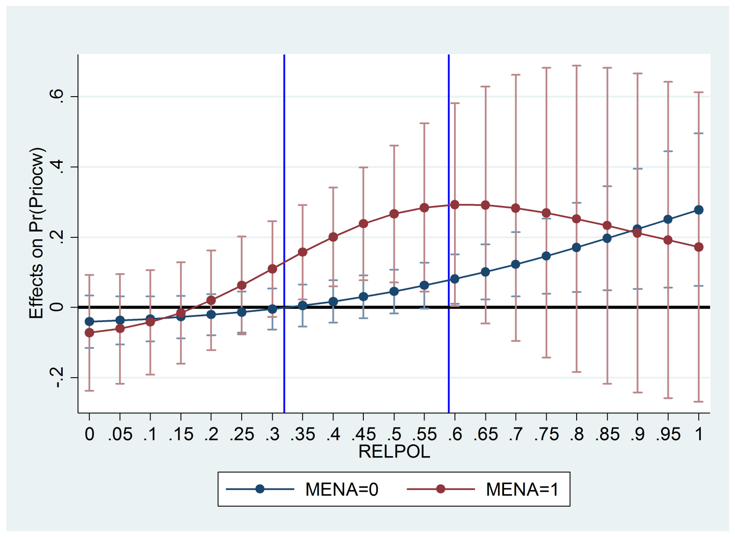 Our paper provides evidence that non-humanitarian and non-neutral interventions intensify religious polarization through their effect on inter-sectarian alienation, increasing the risk of high-intensity conflict in MENA, but not in the rest of the world (Figure 2). In other words, even though religious polarization was not high at the beginning of the estimation period, foreign military interventions have a divisive effect on the behavior of rival sectarian groups. They increased inter-group alienation and therefore identity-based polarization along ethnic and religious lines. These findings are consistent with those of Kristian Skrede Gleditsch, who argues that transnational linkages and the attributes of neighboring states can affect the risk of conflict in a country. He finds that the risk of civil war is substantially higher in countries with many transborder groups on its territory or in countries neighboring fragile or authoritarian states.