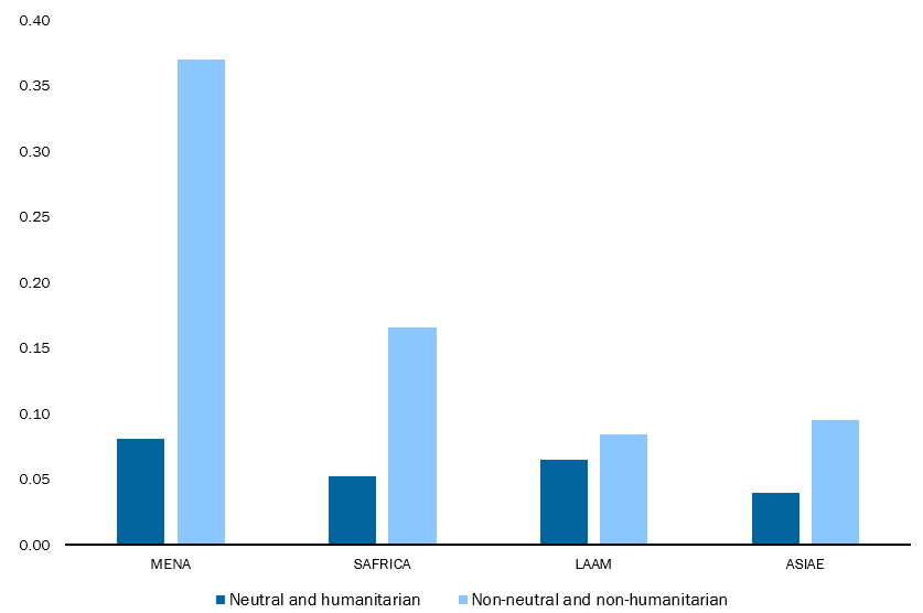 Finally, it is worth stressing that not all types of foreign military interventions increase the risk of conflict. We find no such effect in the case of neutral and humanitarian military interventions, which are evenly distributed across regions and are much less prevalent in MENA than the non-neutral and non-humanitarian ones (see Figure 3). The unintended consequences of the latter provide one explanation for the “Arab Spring paradox” of peaceful protests in middle-income countries leading to sectarian conflict and violent civil wars.