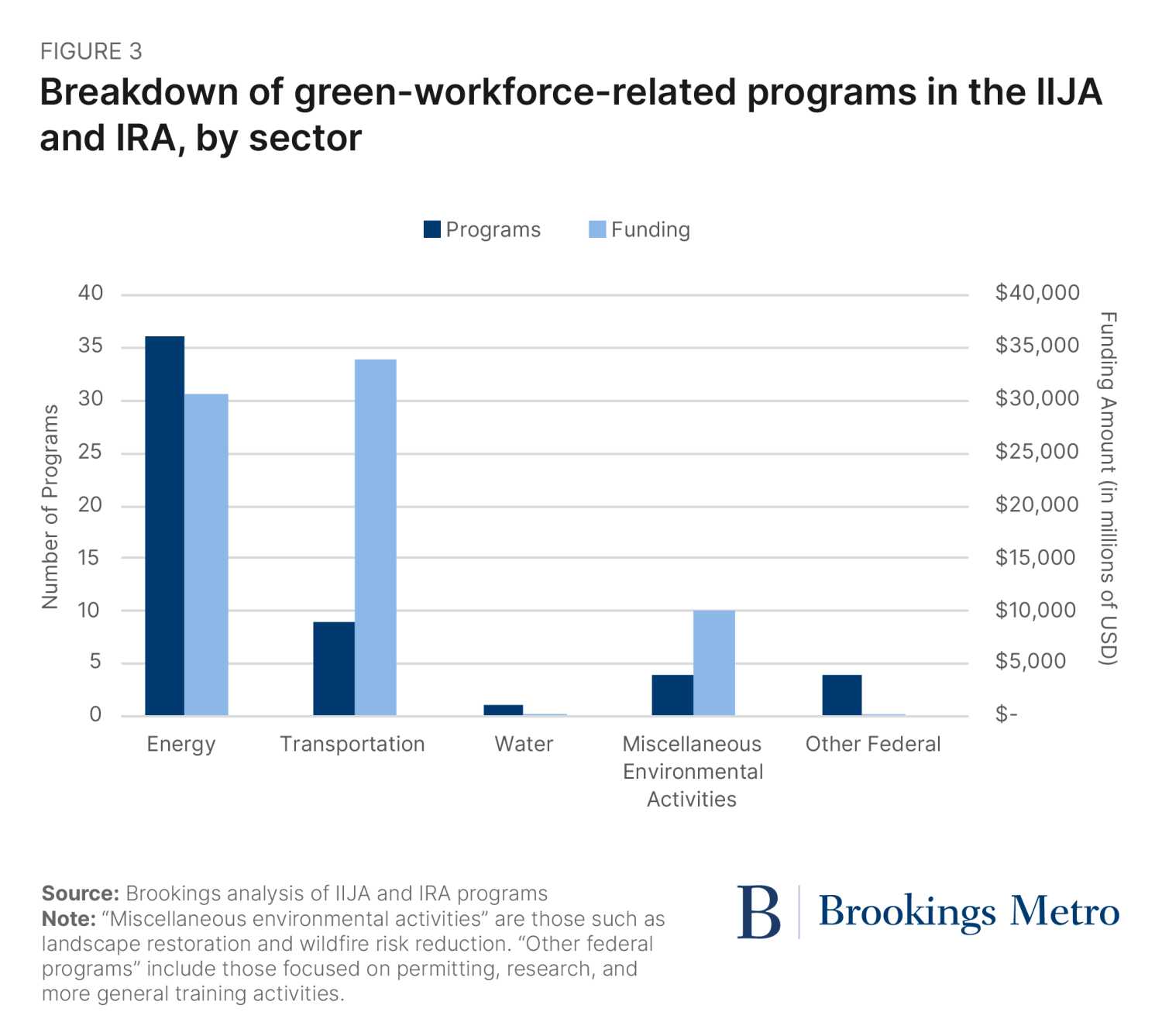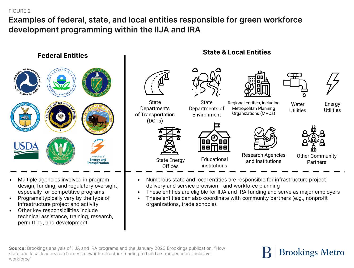 With little precedent on how to operationalize and implement all this federal funding, agencies and executive leadership are scrambling to design new workforce programs, form new collaborations, and simply get IIJA and IRA money out the door. Extensive technical assistance and guidance on infrastructure workforce development—including green jobs specifically—has become a priority for federal leaders as they work alongside state and local entities eligible to receive funding. A Brookings report released earlier this year highlighted the wide range of federal, state, and local partners involved in this process.