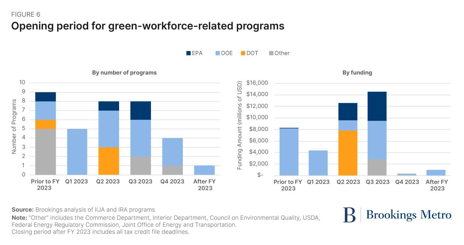 - Most IIJA and IRA green workforce-related programs have already started to provide funding. Thirty-four programs (totaling $47 billion) have started to provide funding over multiple quarters throughout the federal fiscal calendar (October 2022 to September 2023). These span multiple agencies (e.g., Department of Energy, Department of Transportation), yet many are closing or about to close—signaling the need for local leaders to ensure timely grant applications.