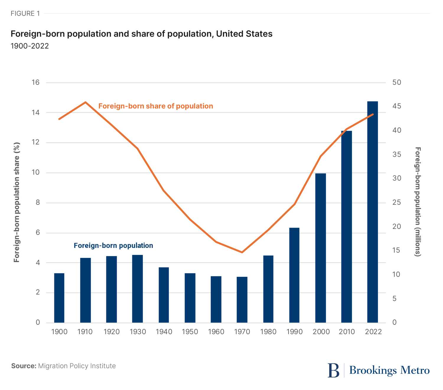 The share of the U.S. population born abroad has been rising for the better part of the last five decades, since the passage of the Immigration and Nationality Act in 1965. Today, nearly one in seven U.S. residents was born abroad, up from fewer than one in 20 residents in 1970, and the foreign-born share of U.S. population is approaching that from the turn of the 20th century (Figure 1).