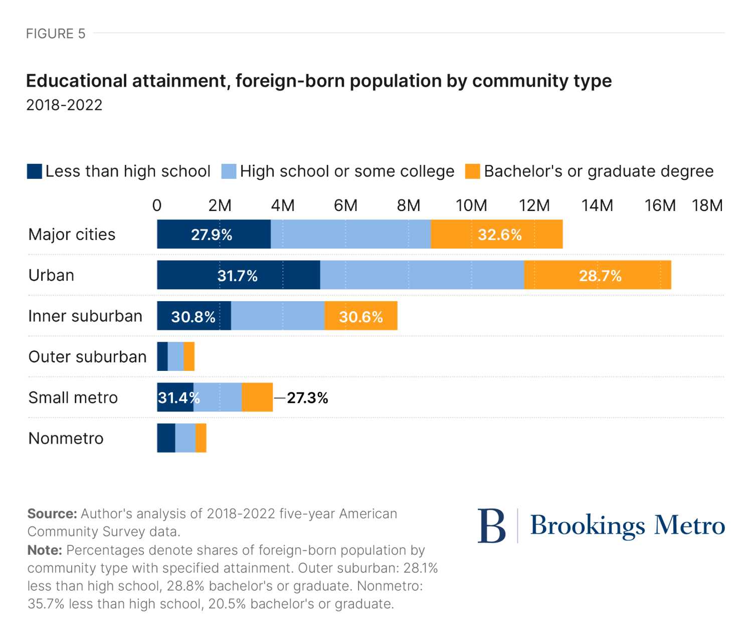 Nationwide, just under 30% of foreign-born adults in the United States in 2018-22 held a bachelor’s or graduate degree. That share was higher in major cities (33%) than in other community types (Figure 5). And because immigrants also make up a large share of the overall population in major cities, they comprise nearly one-quarter (23%) of all college degree holders living in those places, contributing their expertise in key sectors such as health care, higher education, and professional/scientific services. For instance, in San Diego, one of the nation’s leading centers of scientific and technological research, 37% of foreign-born residents hold a bachelor’s or graduate degree, and they comprise 27% of all San Diegans with those credentials.