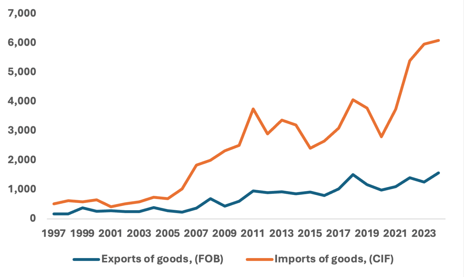 Signed in 2004 and having entered into force in 2006, the USMFTA aimed to make the Kingdom a regional platform for trade and investment, diversify its exports, attract U.S. direct investment, and stimulate employment. Covering goods, services, intellectual property, and investment protection, it was presented as a benchmark. However, nearly twenty years later, the results appear mixed: Imports from the U.S. have grown faster than exports, worsening Morocco’s trade balance (Figure 1). Moreover, according to the World Trade Organization (WTO), in 2024, Morocco’s goods exports to the U.S. constituted only 3.1% of its total goods exports, in contrast to exports to the European Union (EU), which accounted for 65.3% of the total.