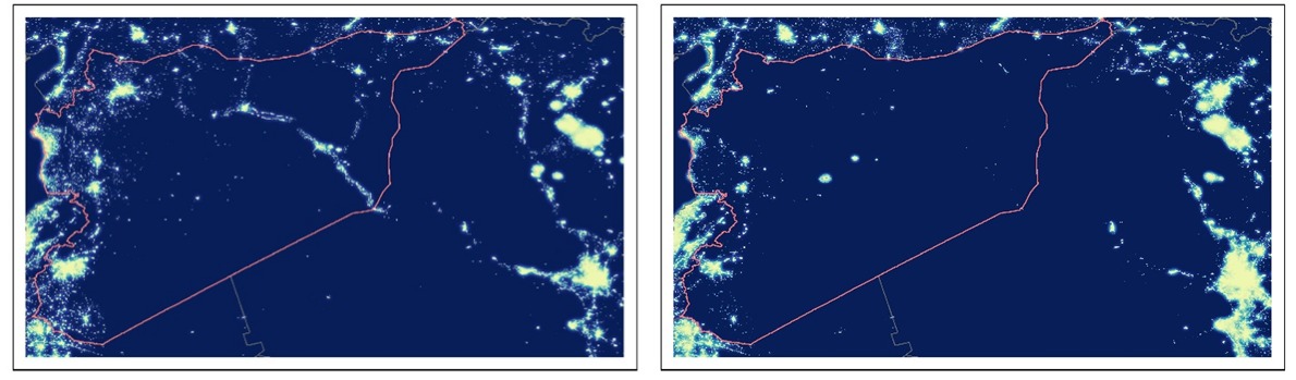 The satellite imagery below shows NASA Earth Observatory nighttime light data from Syria. The left hand image shows a concentration of Syria’s economic activity in two corridors in 2012. A North-South corridor on the country’s Western border, stretching from Damascus in the lower left of the image to Aleppo in the upper-left corner. The second corridor is a diagonal linking Aleppo with Baghdad in the lower-right corner. Just four years later, in 2016, the satellite captured a far darker image reflecting the losses to Syria’s economy and infrastructure during the ongoing civil war. In particular, Aleppo is barely visible, and the road from there to Baghdad no longer supports any economic activity. The luminosity of Damascus and its environs is also sharply reduced.