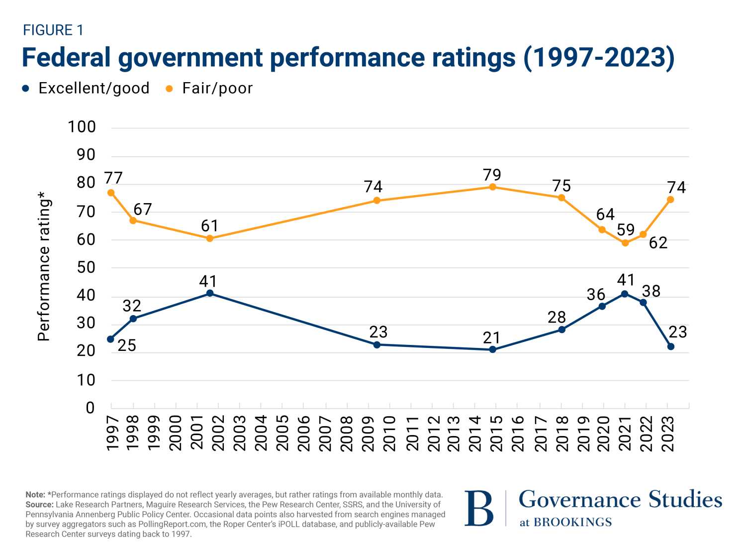 President Biden heads toward the 2024 campaign with the federal government’s job rating in decline, support for a smaller government increasing, and the demand for major government reform at a 30-year high. Biden not only needs to reverse the recent drop in his job rating for running government, but he must also repair the bureaucratic damage Trump left behind and prevent further government breakdowns on his watch.[1]