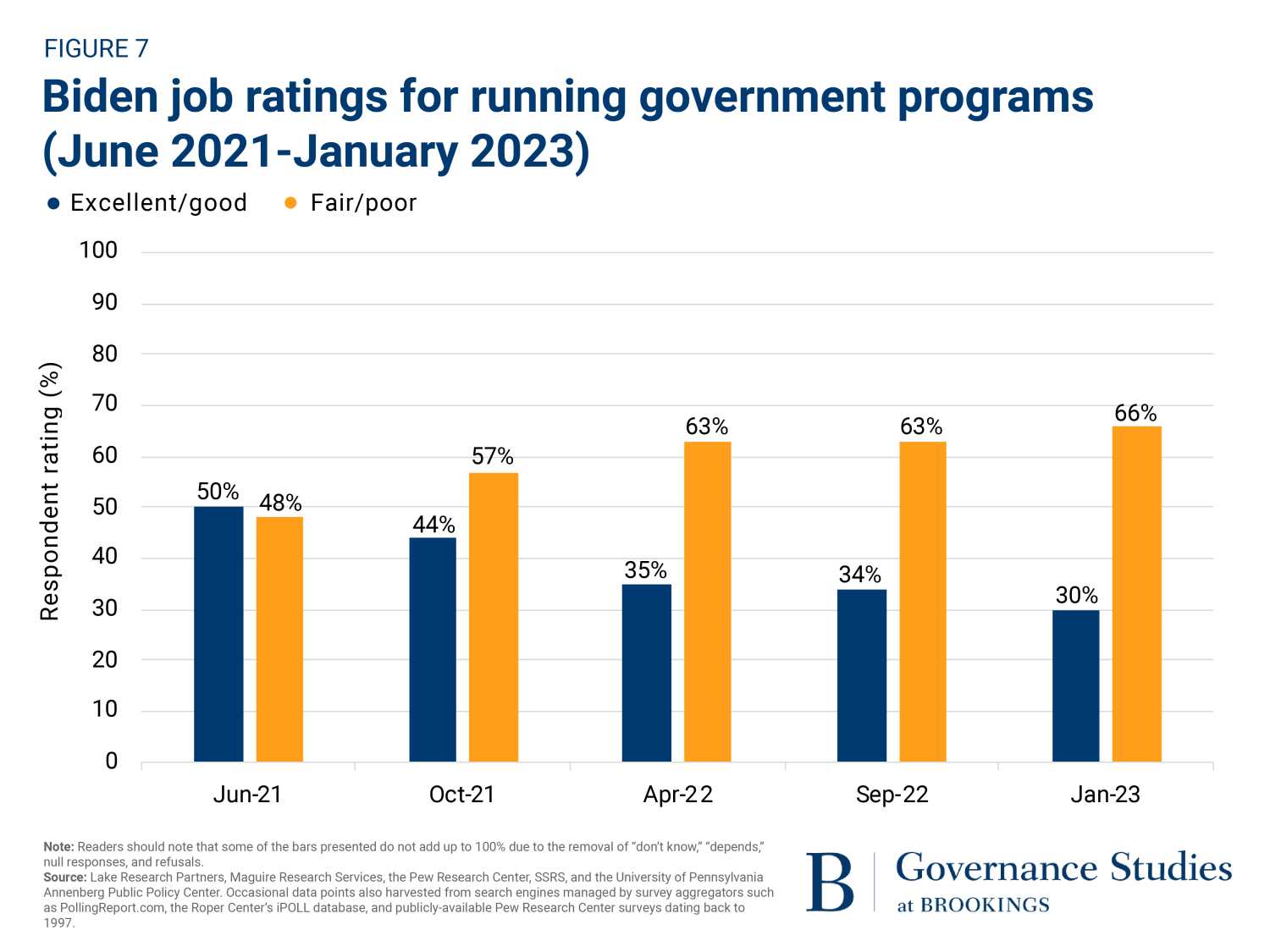 Biden still has time to strengthen his job ratings and reclaim the popularity he enjoyed earlier in his presidency but will need to stop the government breakdowns that deplete public confidence in his governing ability. As show in Figure 7, Biden finished his first June in the White House with a 50% excellent/good rating for running the federal government’s programs but lost ground in every survey over his first year before hitting 30% in January 2023.