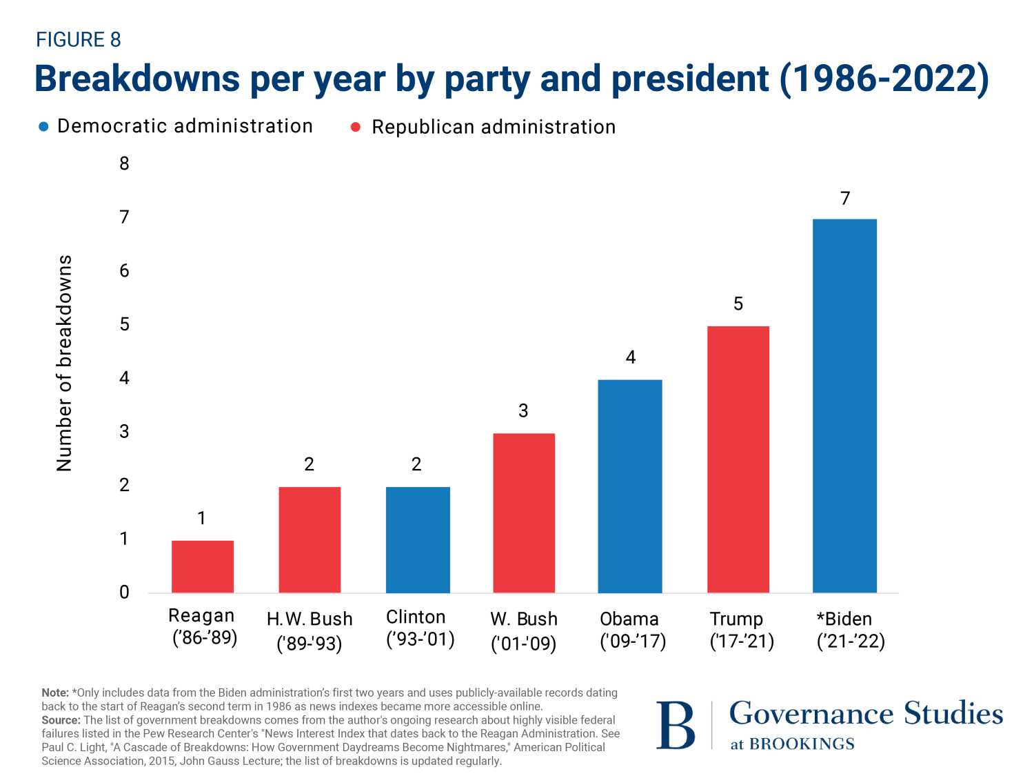 Like presidents before him, Biden’s job ratings are linked to government breakdowns. Defined as a visible failure with high levels of public interest, the recent increase in breakdowns per year strongly suggests the need for presidential leadership on long-needed repairs. As observed in Figure 8, every president since Reagan has added to the breakdown curve, including two per year under H.W. Bush, four under Obama, five under Trump, and six per year during Biden’s first two years in office.[2] It may not be something presidents like to do, but the absence of aggressive reform may be a harbinger of defeat.