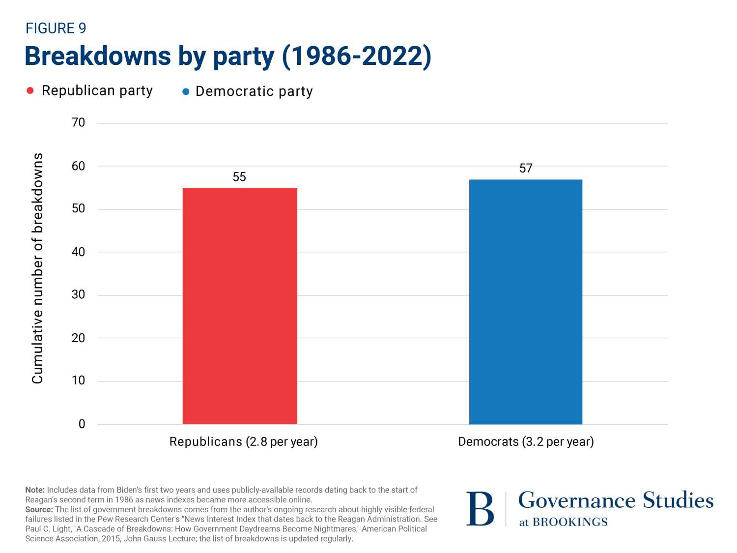 As the rising numbers of breakdowns suggest, breakdowns are almost always a product of pressure, neglect, and overconfidence. Instead of blaming presidents, legislators, contractors, lobbyists, and grifters for government failure, Congress and the president should address their general reluctance to move government repairs to the top of the legislative agenda. Figure 9 shows that Democrats and Republicans were at the wheel for equal numbers of breakdowns over time without a sign that they are ready to work together to reduce the risks in a bipartisan future.