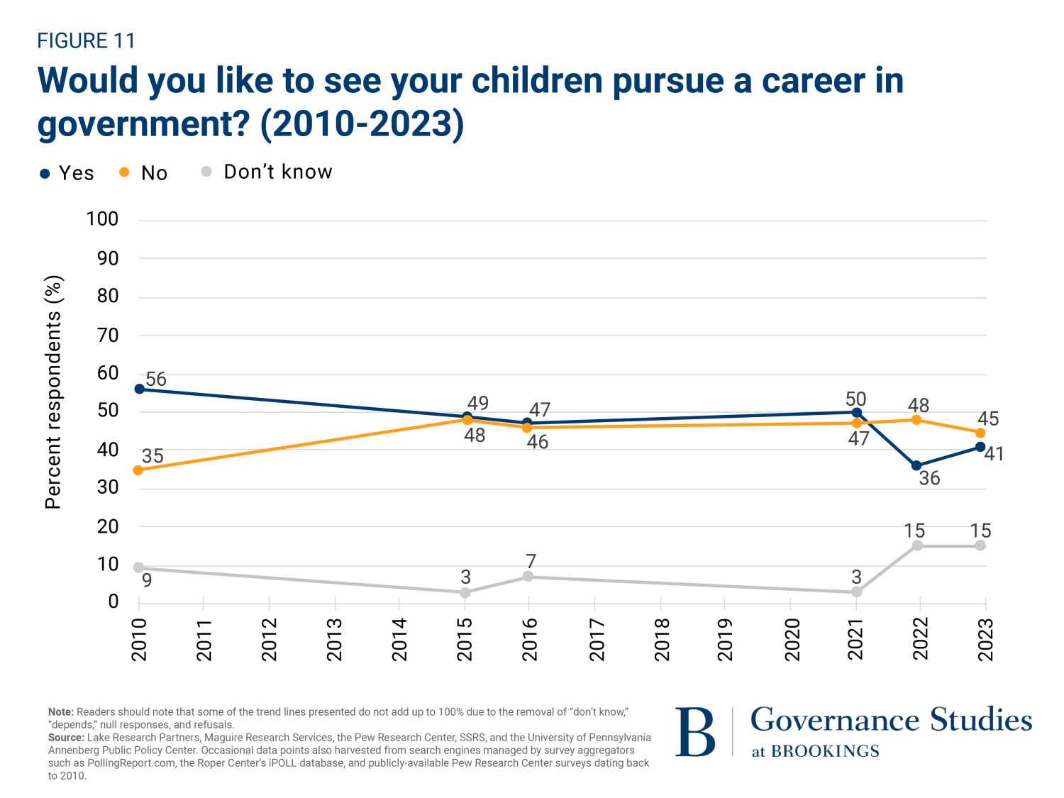 Readers should note the potential impact of the January 6 insurrection on parental support for government careers in the percentages of “don’t know” answers. They might also consider the role of partisanship in shaping support for government performance, given the 56% of Democrats who said “yes” to a career in government for a son or daughter compared with the 62% of Republicans who said “no.”