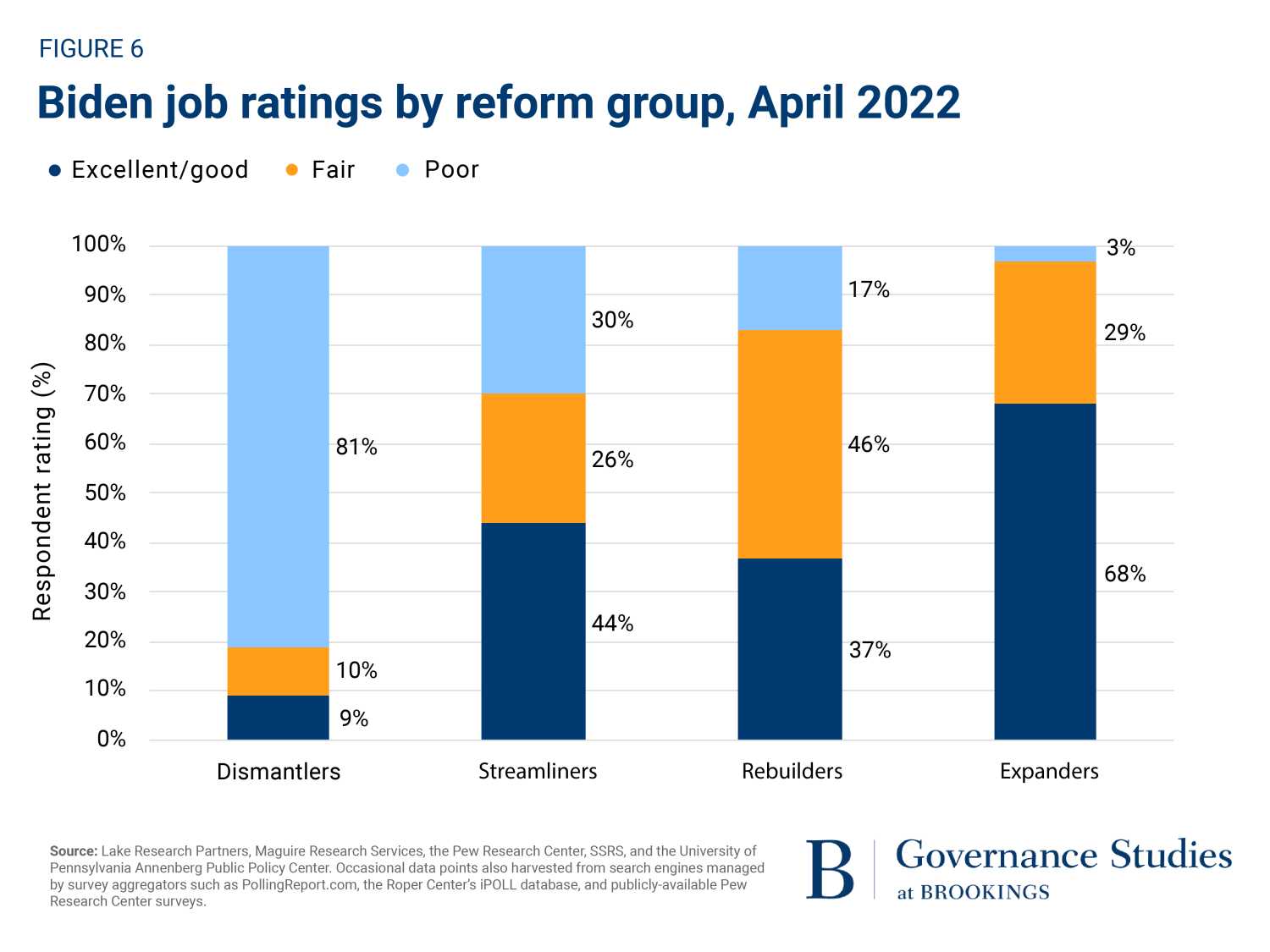 As Figure 6 shows, the dismantlers gave Biden his lowest job ratings for running the federal government and its programs in January 2023, while the expanders gave Biden his highest ratings. Facing continued pressure to improve government performance, Biden might find inspiration in Vice President Gore’s 1993 promise to make government “cool again.” Although his commitment to reinventing government was not enough to secure the presidency, his focus on $400 government hammers, imminently breakable ashtrays, and $600 toilet seats gave him the government reform visibility that Biden needs to address the recent surge in government breakdowns on his watch.
