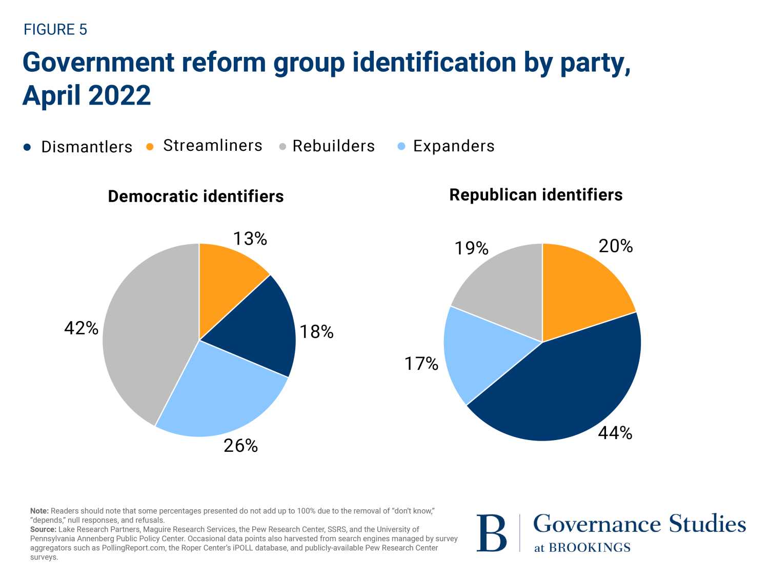 As Figure 5 shows, dismantlers accounted for 44% of Republicans in April 2022 with streamliners in second position at 22%, while rebuilders accounted for 42% of Democrats with expanders in second position at 26%. Hard as the two political parties work to expand their bases, neither can win without holding their core support.