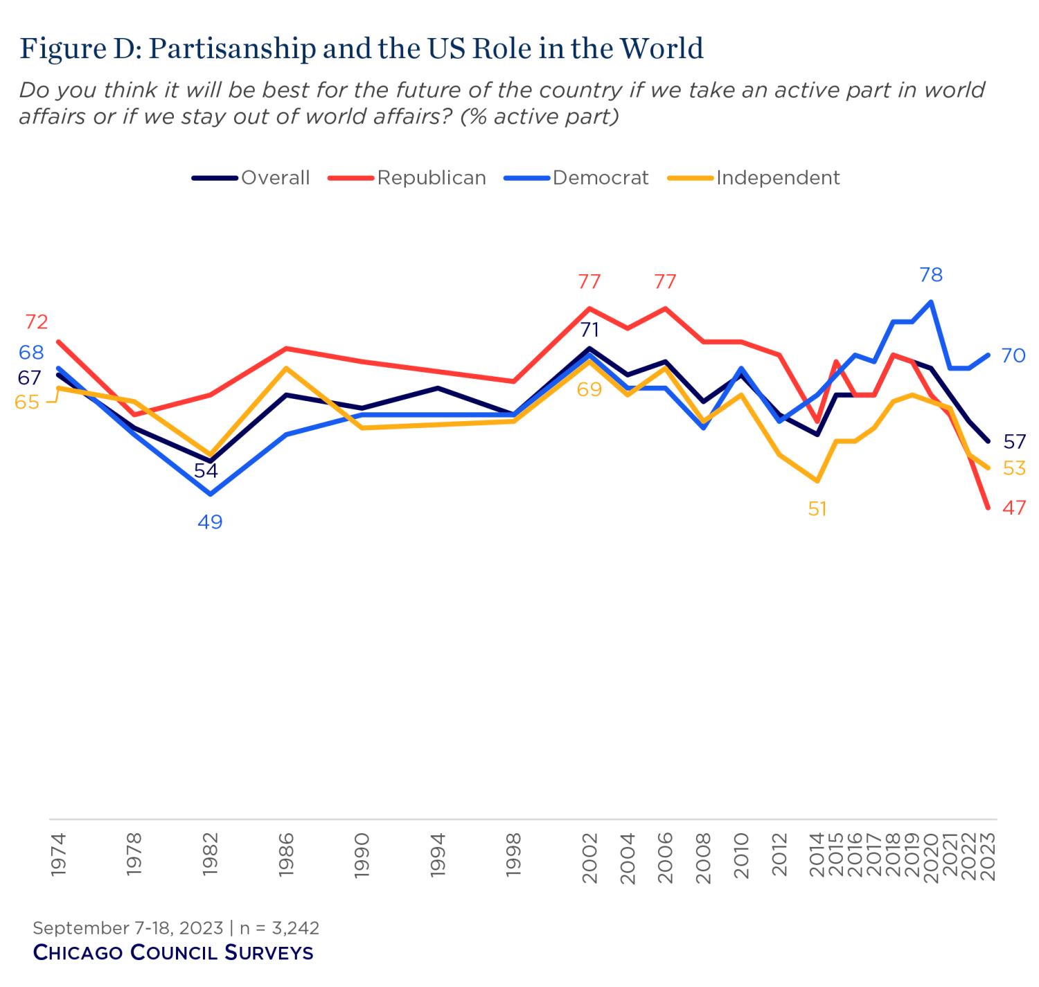 Over the past 50 years a majority of Americans—Democrats, Republicans, and Independents—have supported U.S. active engagement in world affairs. Up until the past decade, Republicans were somewhat more supportive than Democrats and Independents. But, as shown in the chart below, since 2016 the positions of those who identify as Democrats and Republicans have flipped, with Democratic support increasing and Republican support declining (see chart below from the Chicago Council on Global Affairs).