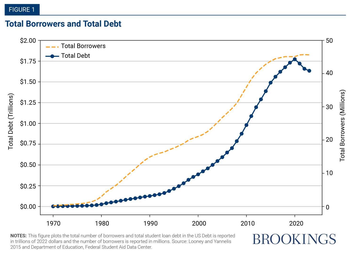 Between 2000 and 2020, the total number of Americans owing federal student loans more than doubled from 21 million to 45 million, and the total amount they owed more than quadrupled from $387 billion to $1.8 trillion, growing much faster than any other form of household debt. Figure 1 shows the growth in student loan borrowers and balances.
