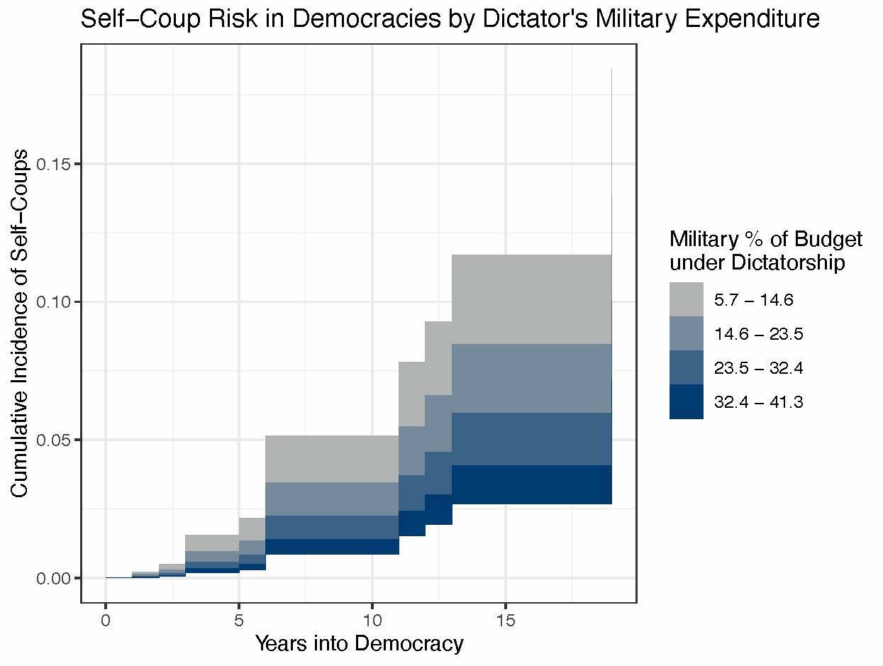Figure 3 plots this dilemma on the 80 democratic transitions between 1950-2010. Transitions that inherited the most empowered militaries from dictatorships — where the dictator was spending more than 30% of the budget on the military — were almost four times more likely to fall to coups. By 10 years into democracy, they had a 40% chance of having fallen to a coup. By contrast, transitions inheriting the most marginalized militaries were far more likely to succeed, with less than a 10% chance of falling to a military coup. In short, democratization is far easier with marginalized militaries.