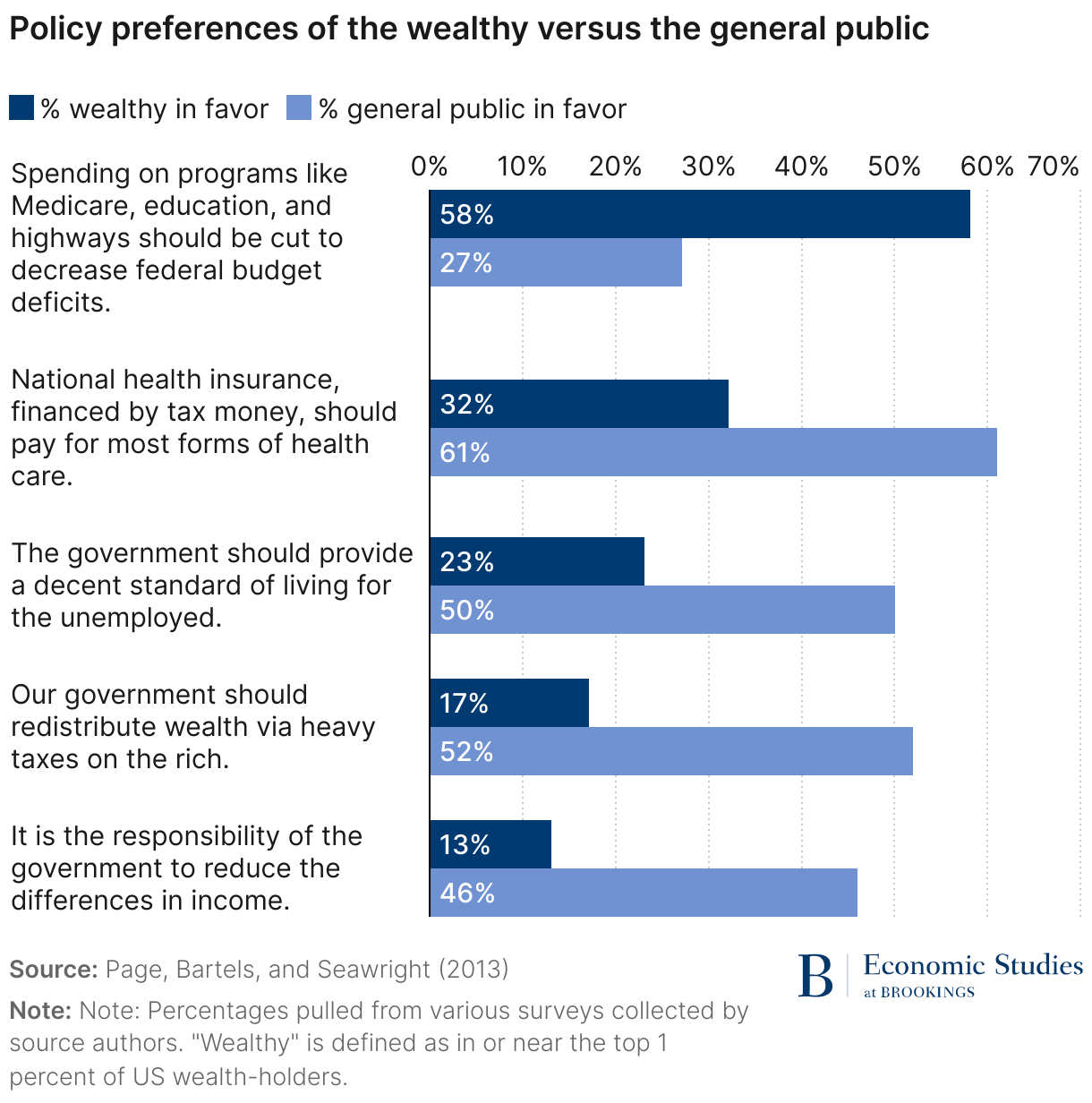 The divergence between public opinion and legislation has deep roots. Scholars have confirmed that legislative outcomes tend to reflect the preferences of wealthy citizens. As shown in Figure 1, the preferences of the wealthy and the general public often differ sharply, with more affluent individuals generally backing less spending on social programs and lower taxes on the wealthy. Enacted legislation often reflects these positions, and recent research confirms that these gaps remain persistent.