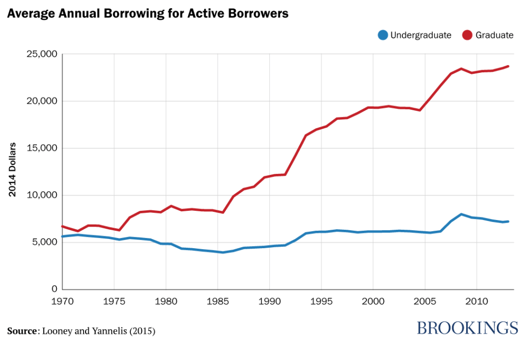 - Borrowing for graduate school has increased sharply. Between 1994 and 2014, for instance, average annual borrowing by undergrads increased about 75% (to $7,280) while average annual borrowing by grad students rose 110% (to $23,875).