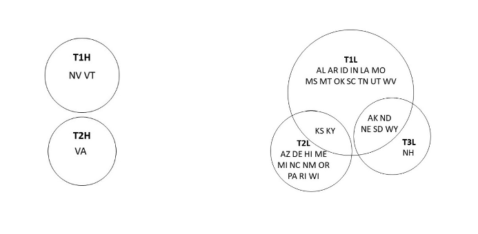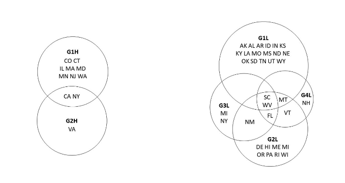 In describing these parsimonious configurations, we provide Venn diagrams that show the relationships between groups of states. In these diagrams, the size of each circle or ellipse is representative of degree of coverage of the configuration within the overall solution, so a larger circle indicates greater coverage and explanatory power in the model.