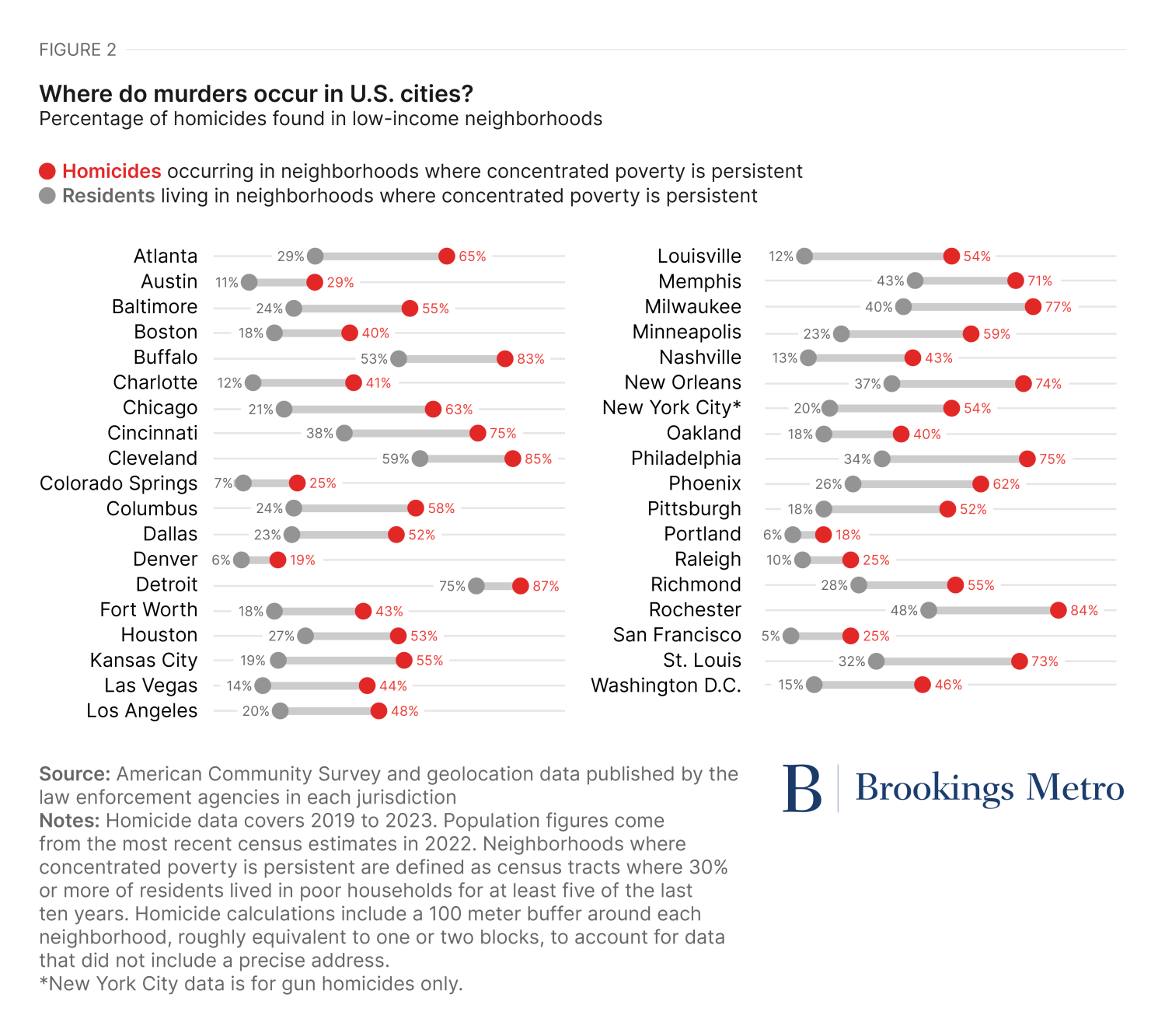 If you map the location of murders in U.S. cities, a clear pattern emerges. Some neighborhoods have no murders, while others experience large numbers of homicides. The places with the most murders tend to have something in common: Almost all of them are neighborhoods with concentrated poverty—residential areas where at least 30% of the population lives below the poverty line.2