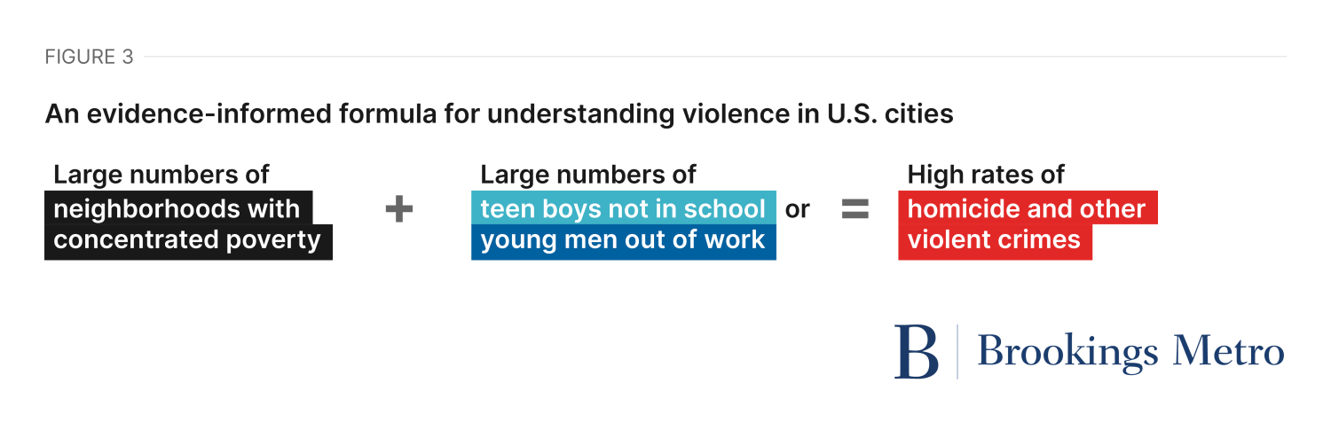 These two findings can be combined into a formula for understanding patterns of violence in U.S. cities. (See Figure 3 below.) When a city has large numbers of low-income neighborhoods combined with large numbers of teen boys not in school or young men out of work, it is likely to have high rates of homicide and other forms of violence.