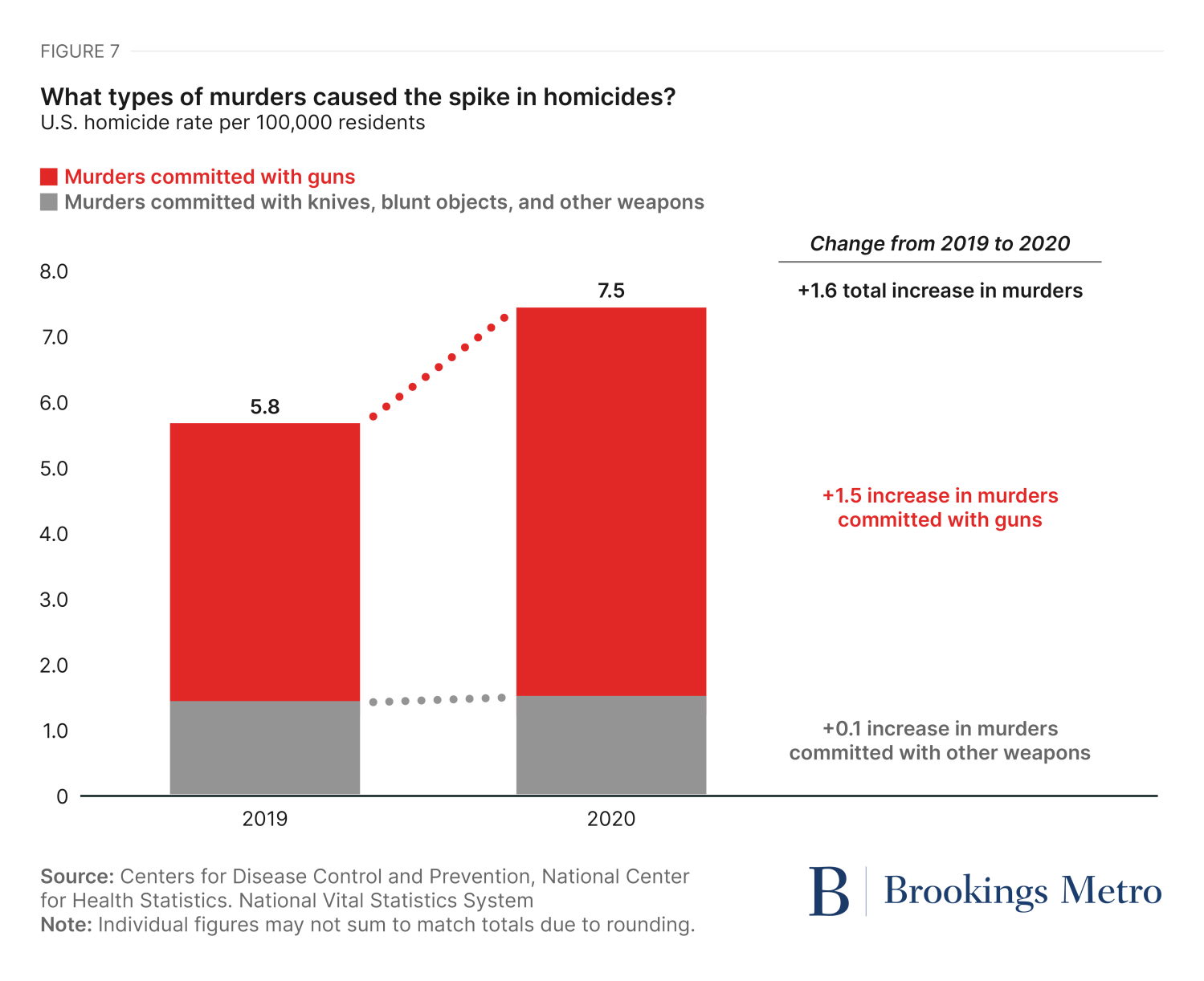 Some authors have noted that the spike in murders during the pandemic was not seen in other wealthy countries, which suggests that it must be connected to something different in the United States. The data from U.S. cities highlight one additional factor that reveals why America’s violence was so unique: Almost all the increases in homicides during 2020 were due to murders committed with guns. (See Figure 7.)