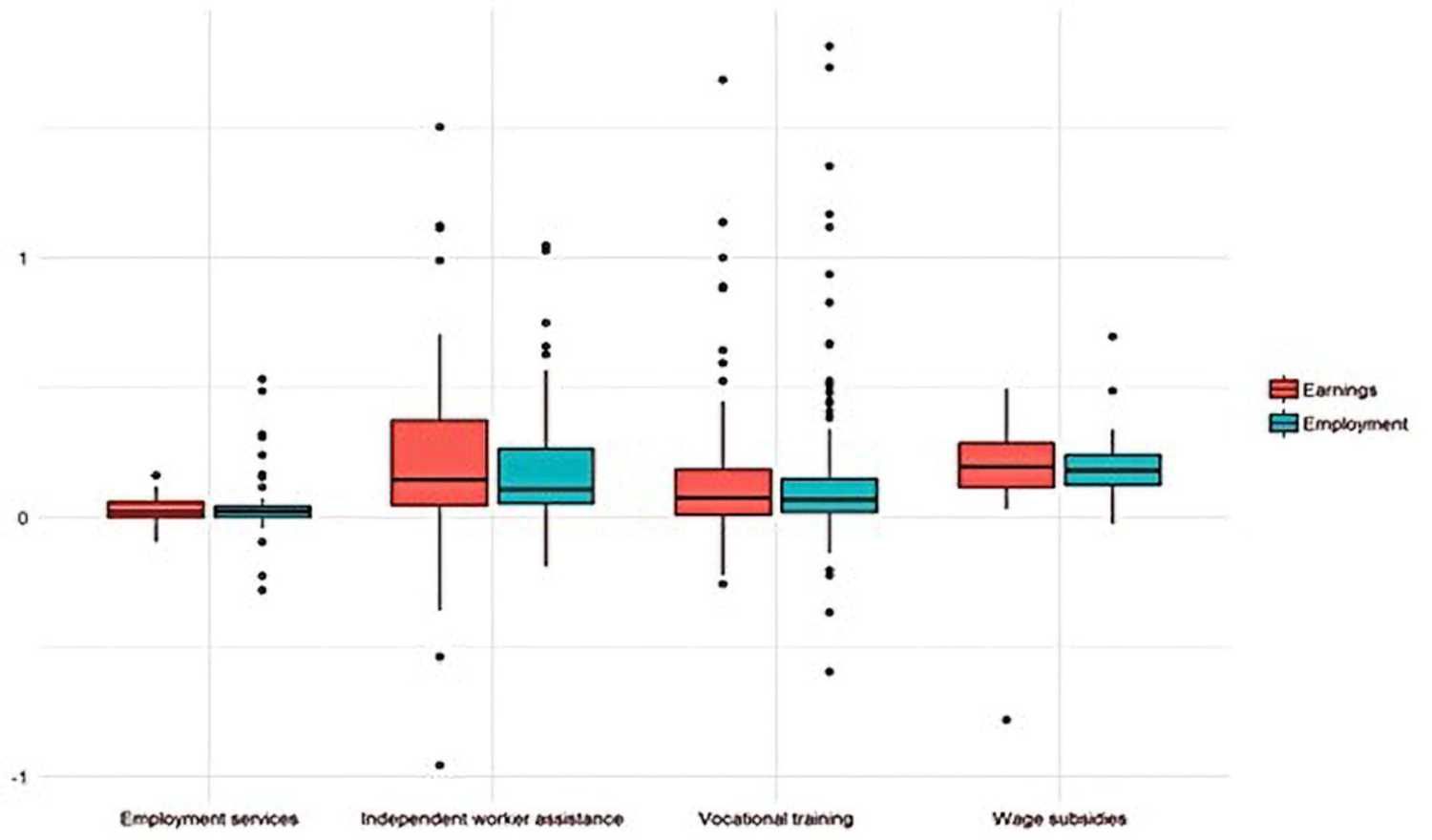 Figure 1. Distribution of estimated impacts of four types of ALMPs