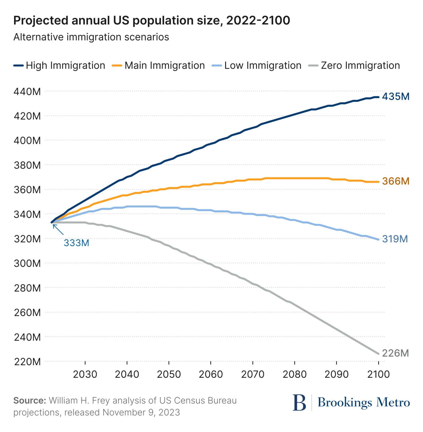 U.S. Census Bureau projections based on a range of immigration levels make this clear. If recent decades’ immigration levels held, the U.S. population would start declining after the year 2080. Under a “low” immigration scenario (similar to those in President Trump’s first term), population declines would begin in 20 years. And under a “zero” immigration scenario, the U.S. population would begin declining soon. Only under a scenario with 1.5 million new immigrants per year or higher—a level observed occasionally in the past—would the U.S. population continue to grow for the rest of the century. (See Figure 1.)